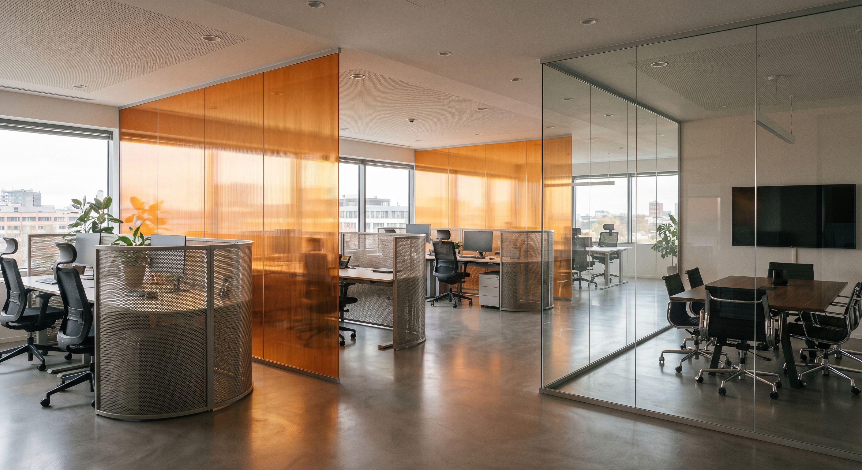 interior oficionas on, lo naranja es vidrio estriado ambar, el suelo microcemento, lo q sea metalico es una membrana microperforada y el cristal de la sala de reuniones tansparante , keep exact camera angle