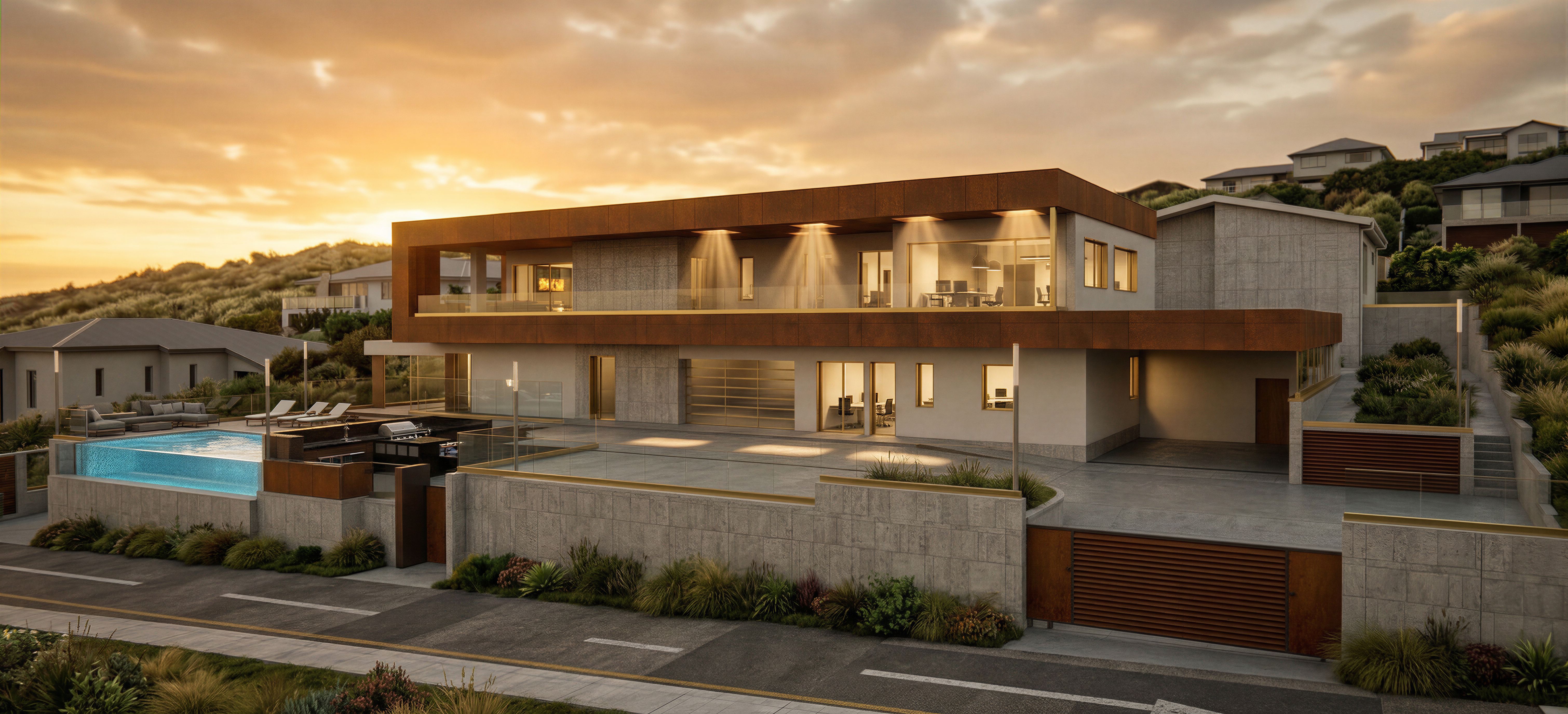 EnhancedPromptCreate a highly photorealistic, high-resolution image. Use the materials shown in the "reference image1". There are Corten-effect Alucobond panels; light-colored plaster; glass parapets with a brass-colored aluminum profile underneath; the thin window and French window frames are brass; the volume in the center of the building, visible on the ground and first floors, is clad in concrete-effect tiles. The exterior flooring is industrial concrete; the exterior walls are clad in the same concrete-effect tiles as the building; the horizontally slatted doors seen at the bottom right are made of Corten panels, identical to the Corten cladding of the building; on the first-floor balcony ceiling, there are dark, square-shaped areas, which are square holes that allow light to penetrate from the sky to the first-floor balcony; it shows volumetric rays of light passing through these square holes. The transparent light blue parts are made of clear glass., keep exact camera angle, keep exact camera angle