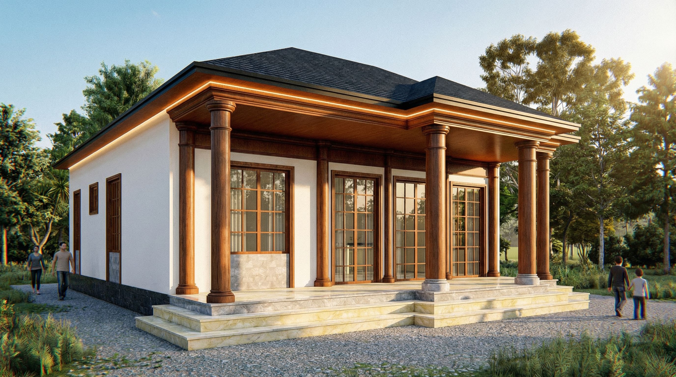 This photograph depicts a classic residential building with large, dark-toned natural wood columns, a black tiled roof, and large windows with intricately carved wooden frames and glass panes. The smooth white facade is balanced by dark natural stone accents at the base. The entrance steps are paved with cream-gray marble with veins, and the risers are clad in light yellow-cream marble with veins. The roof base is painted to resemble wood, with underglow lighting. Set in a tranquil rural setting with nearby greenery, the scene is illuminated by the warm light of late afternoon, creating soft shadows and highlighting the texture of the materials. Shot from a low angle to emphasize height and grandeur, this perspective conveys a sense of solemnity, with the 35mm lens creating a subtle depth of field effect., keep exact camera angle