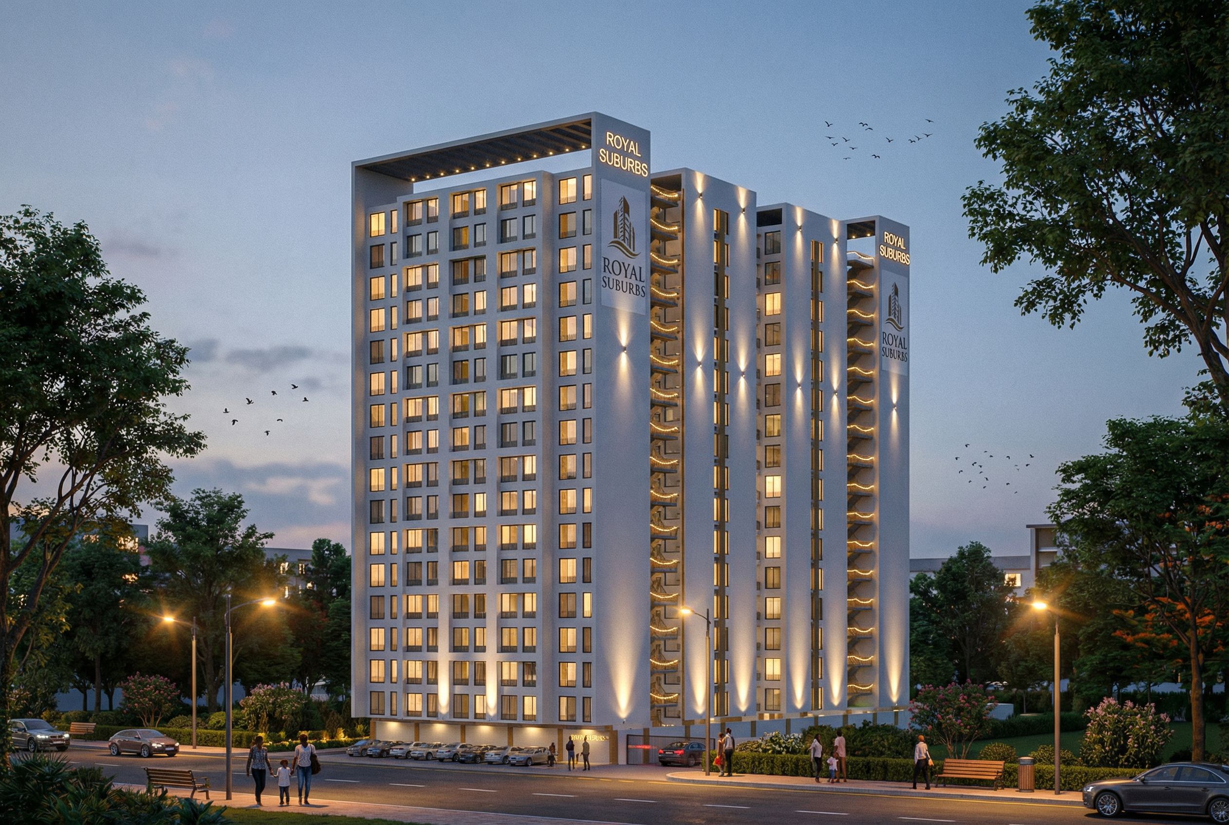 PERSPECTIVE SHOWING AN APARTMENT IN A RESIDENTIAL SUBURB WITH LIGHTS TURNED ON IN THE BUILDING. INCLUDE SOME SPOT LIGHTS, ROPE LIGHTS AND STREET LIGHTS IN THE IMAGE. INCLUDE SOME VISITORS PARKING IN FRONT OF THE BUILDING. PUT VEHICULAR ENTRY AND EXIT ON THE RIGHT SIDE. MAKE GLASS CLEAR, REFLECTIVE AND REALISTIC. USE WHITE WALL MASTER AS A FINISH. INCLUDE SOME BIRDS IN THE SKY AND PEOPLE OF AFRICAN ORIGIN IN THE FOREGROUND AND SOME CHILDREN TOO. INCLUDE GRAPHICS "ROYAL SUBURBS" ON THE BUILDING. MAKE COLOUR OF BUILDING PEARL WHITE., keep exact camera angle