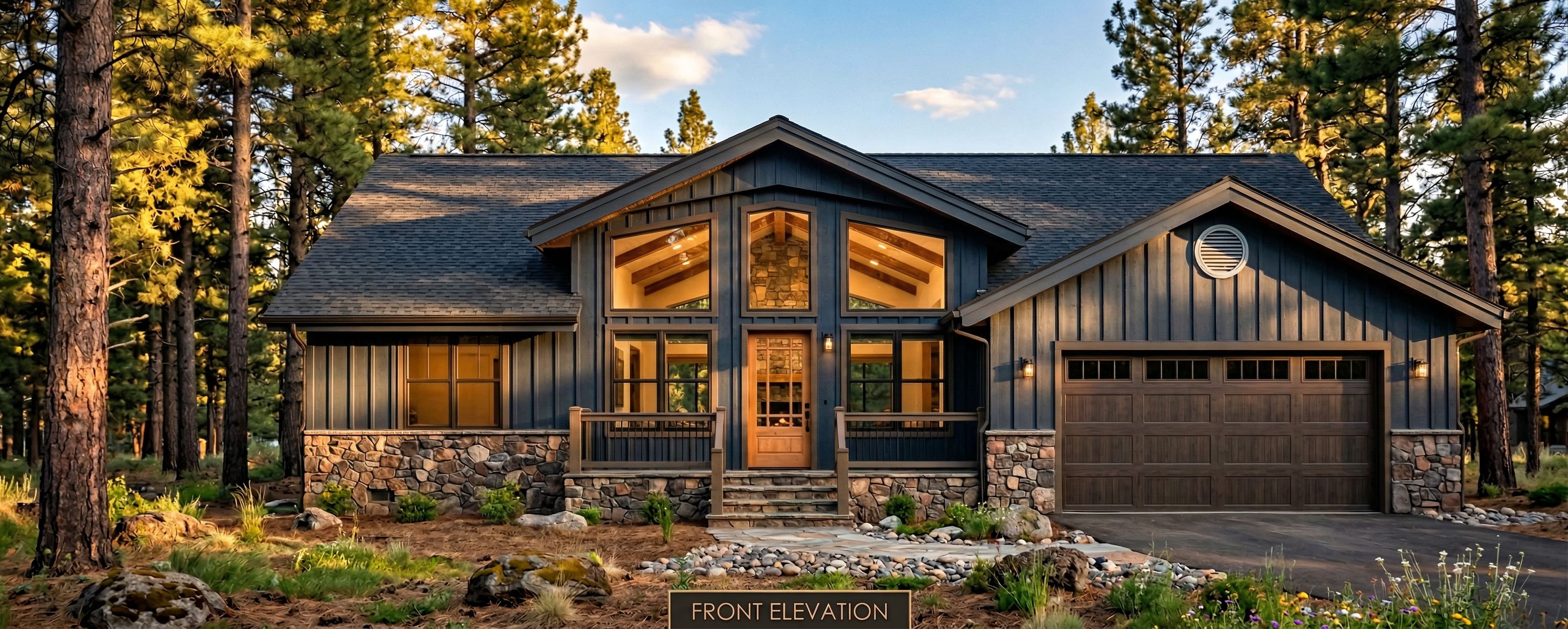 Photorealistic exterior rendering of this custom home, surrounded by tall ponderosa pine trees, warm afternoon sunlight, natural stone foundation, blue sky, professional architectural visualization, keep exact camera angle