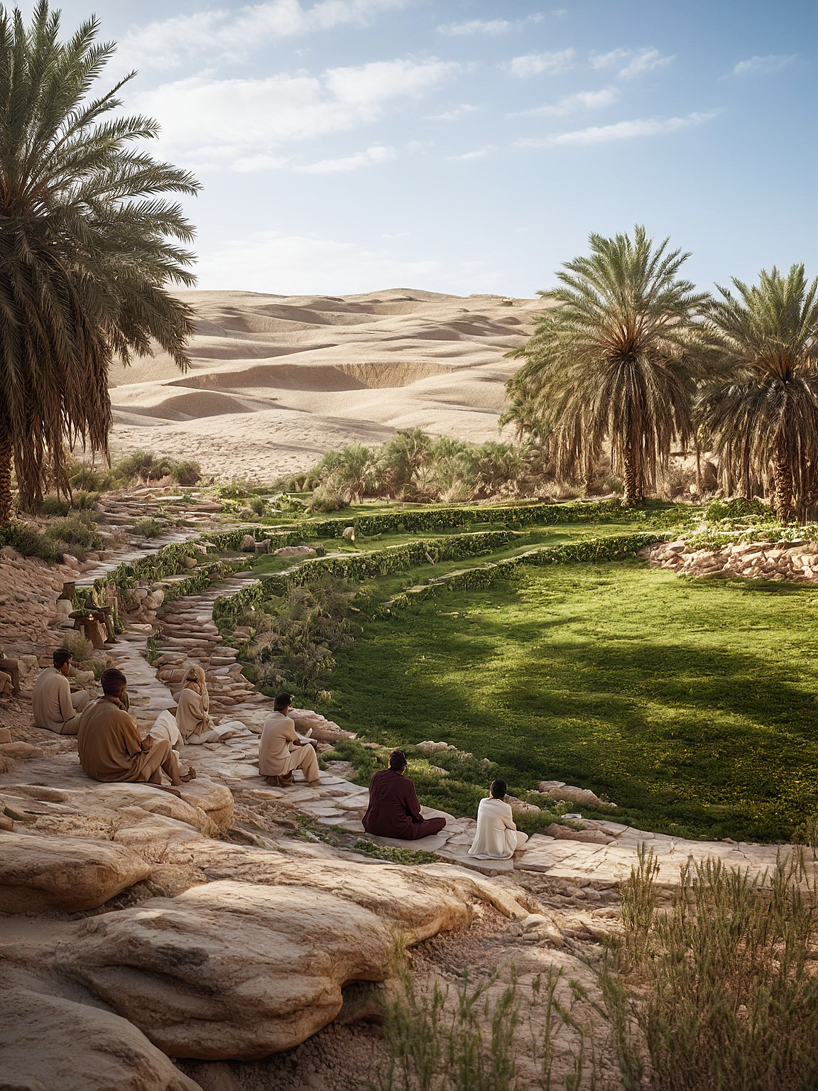 enhance overall image. this is a natural seating area in a luxury desert resort. the stairs are made up of stones and greenery grass all around with desert palm trees overlooking arabian desert sand dunes.