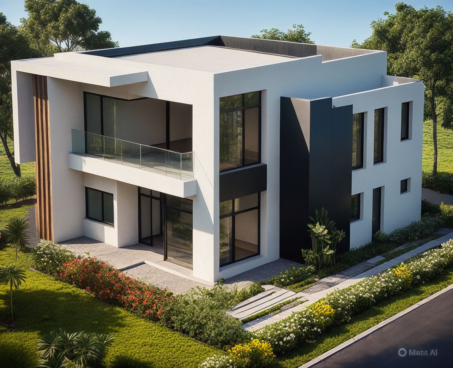 PromptPhoto of a modern residential building with a sleek, minimalist design featuring a combination of smooth stucco and dark textured panels. Surrounded by lush greenery and blooming flowers, the structure is emphasized by large glass windows allowing natural light to flood the interior. Captured in the late afternoon, soft shadows create depth, accentuating the architectural details. The perspective is slightly elevated, showcasing the entryway and surrounding landscape, with a focus on vibrant colors and textures. Ideal for architectural visualization, emphasizing realism and lifelike qualities.