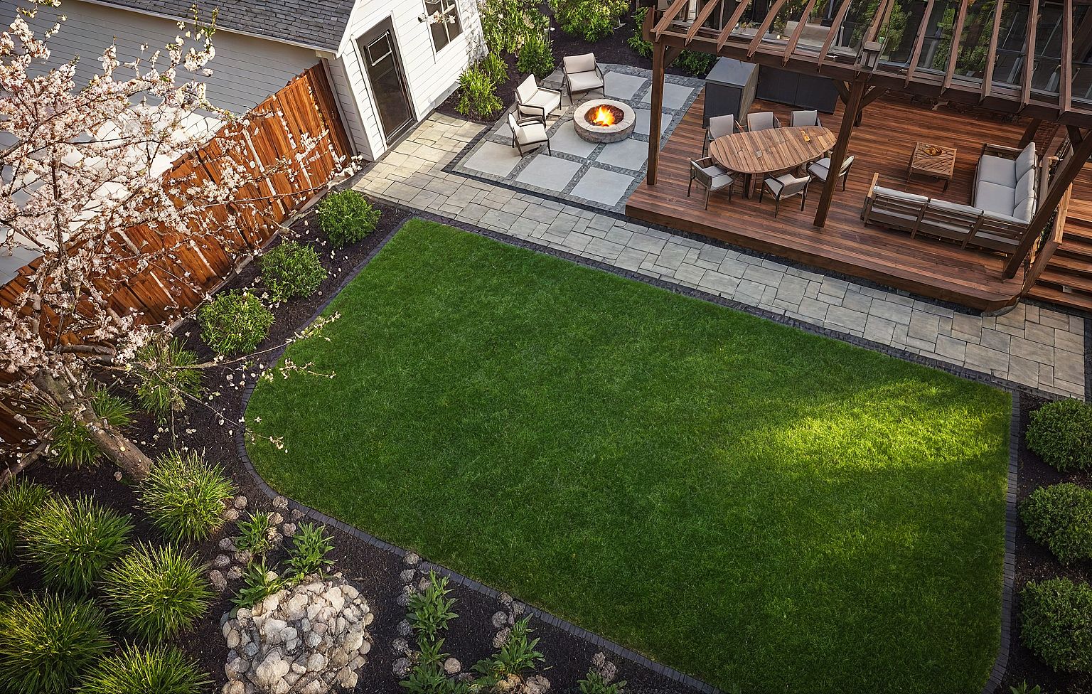 PromptPhoto of a cozy backyard patio featuring a wooden deck area surrounded by vibrant landscaping. Emphasize the rich textures of the wooden beams and flooring, complemented by a stone pathway leading to a modern fire pit. Urban setting includes flowering cherry trees and lush greenery that create a serene atmosphere. Lighting captures a warm afternoon glow, casting soft shadows on the lawn. Camera angle from above provides a wide perspective, showcasing the harmonious layout and inviting features of this outdoor retreat, inviting relaxation and social gatherings.