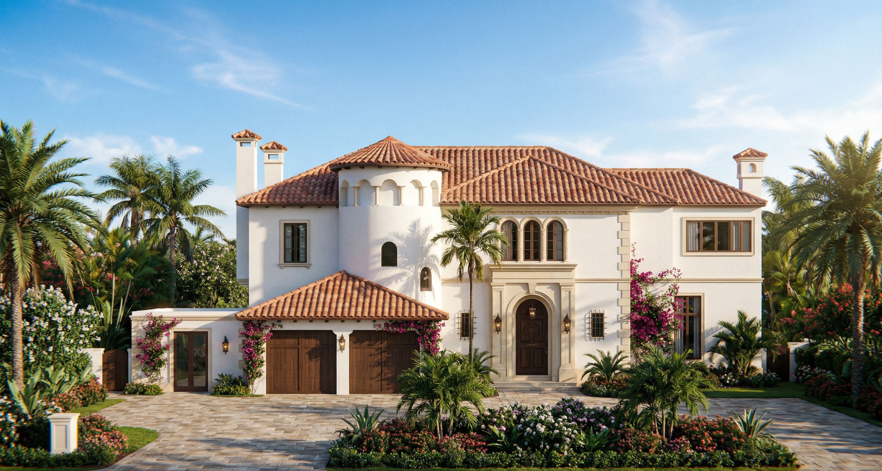 Render this elevation as a photorealistic Mediterranean / Palm Beach style house.