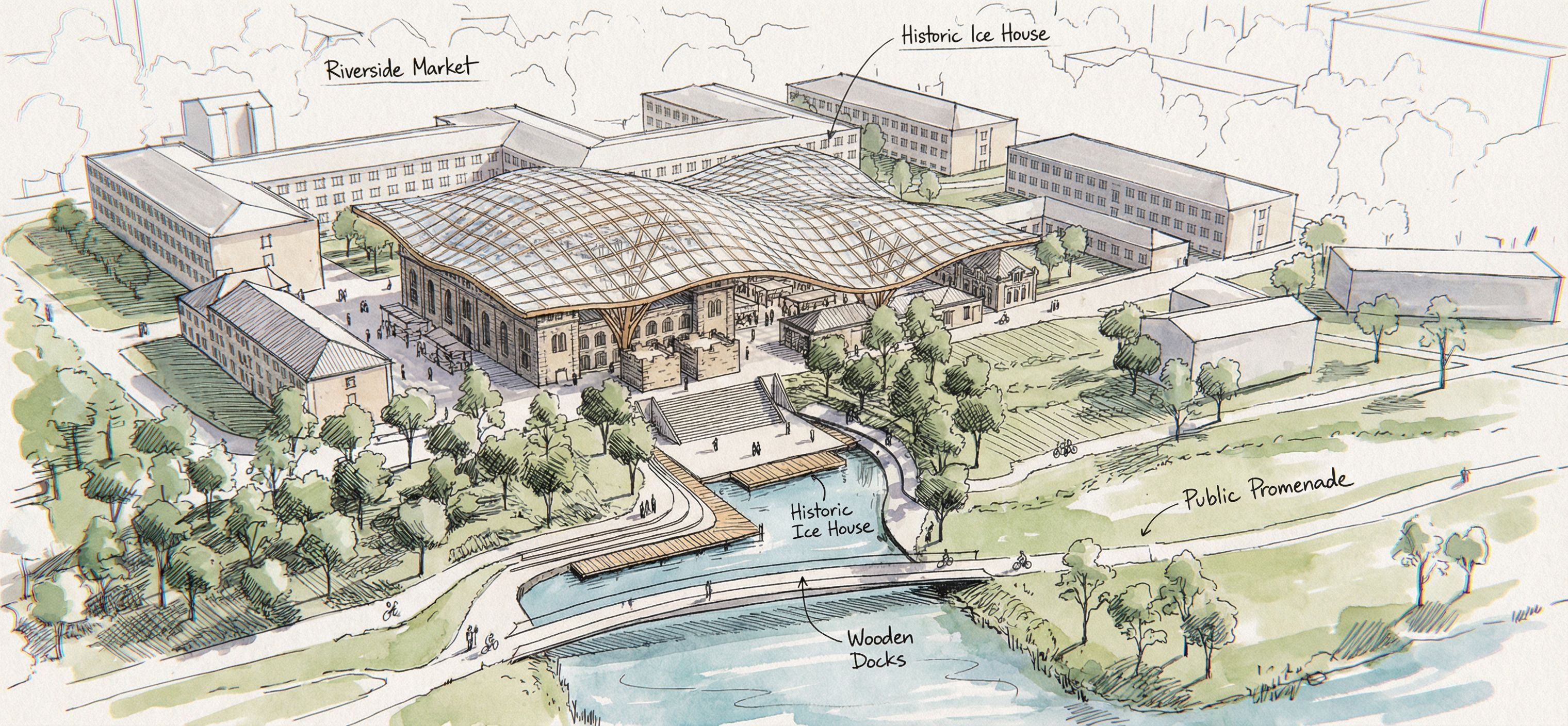 Transform this architectural design into a hand-drawn architectural sketch / competition style drawing while keeping the main design idea. The project is a riverside market located in the historic Braník Ice House complex in Prague. Show a large flowing roof structure inspired by water waves covering the historic ice house building and extending outward to partially cover an outdoor market space. The roof should feel light, organic and continuous like a flowing landscape. Emphasize the relationship between the market and the river: – terraces and wide steps descending from the market plaza toward the water – wooden docks and platforms touching the water surface – a pedestrian bridge connecting paths across the river bay – people walking and cycling along the riverside promenade The terrain should slope gently toward the river. The market space should appear open and public, with people gathering under the roof and in the outdoor plaza. The historic ice house building remains visible under the roof canopy. Tree-like branching columns support the roof structure. Focus on pedestrian movement and public space rather than roads or vehicles. STYLE: architectural sketch, hand drawn architecture illustration, ink line drawing with light watercolor shading, architectural presentation drawing, competition concept sketch, minimal rendering, expressive lines, soft colors., keep exact camera angle