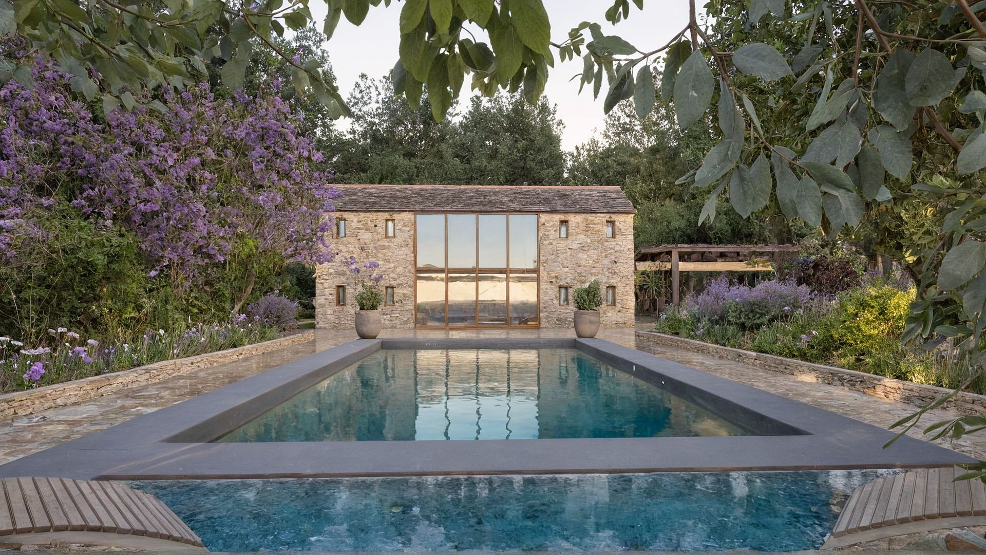 PromptSTONEWORK BARN CONVERSION WITH POOL AND WILDFLOWER RAIED BEDS ON EITHER SIDE
