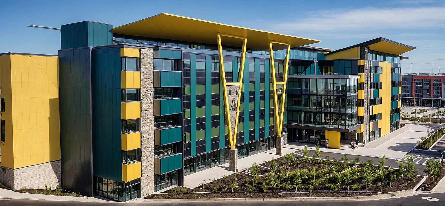 PromptPhoto of a contemporary student hostel, mixed-use building characterized by bold geometric shapes and vibrant colors. Architectural details include sleek glass facades, vibrant yellow accents, and textured stone cladding. Situated in an urban environment, surrounded by modern structures and green landscaping. Soft natural daylight illuminates the scene, creating defined shadows and highlights on the façade. Captured from a low angle, emphasizing the height and structure, with a wide-angle lens to include pedestrians engaging in the lively street scene. Parking and signage .