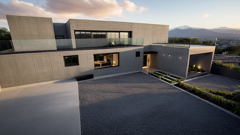PromptMAKE REALISTIC WITH CONCRETE WALLS AND PLANTS ENTER TO A HOME AND DRIVEWAY MOUNTAINS IN THE BACK