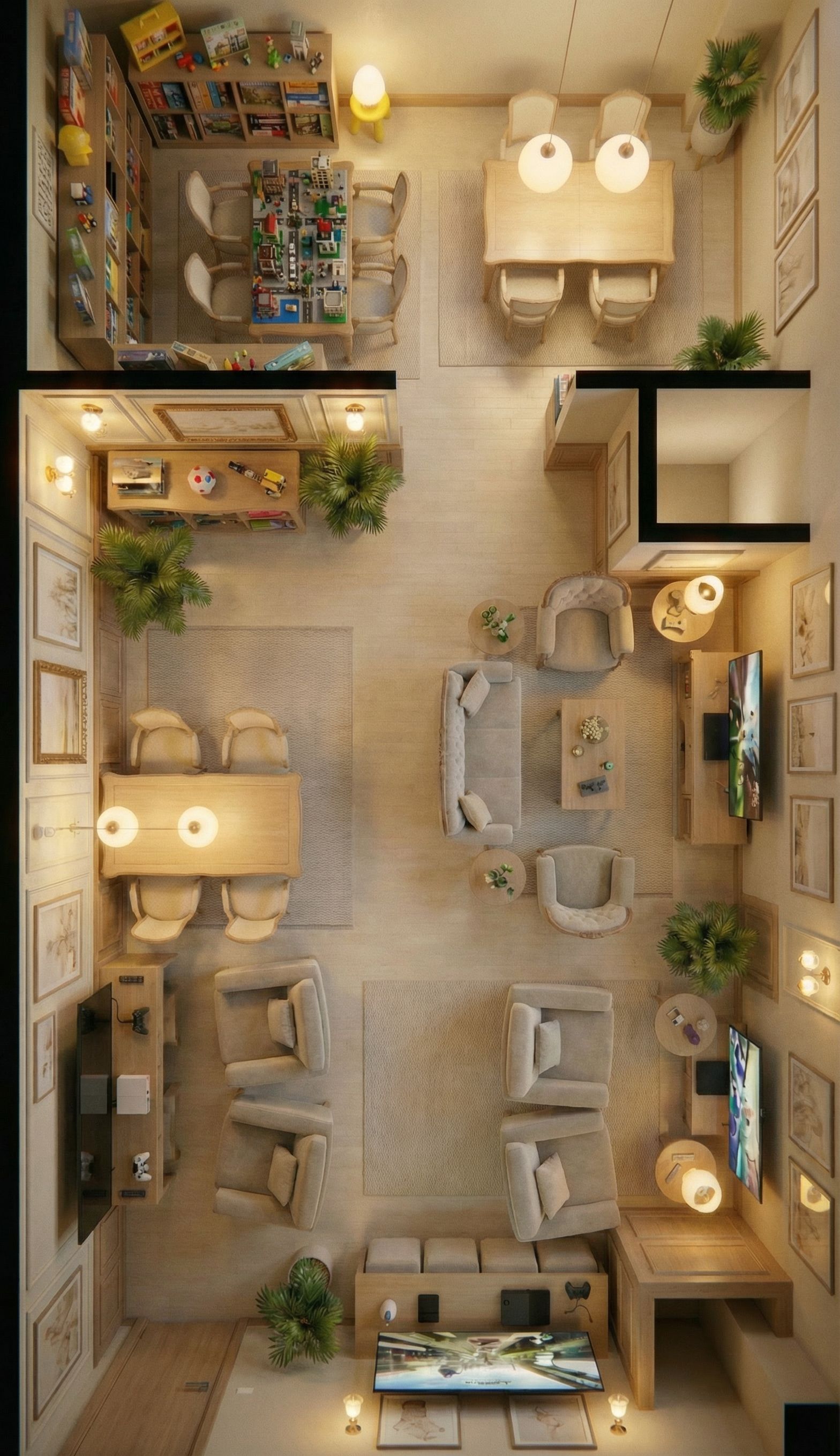 Promptuse exact furniture as plan (in reference image), and use lighter color theme, keep exact camera angle