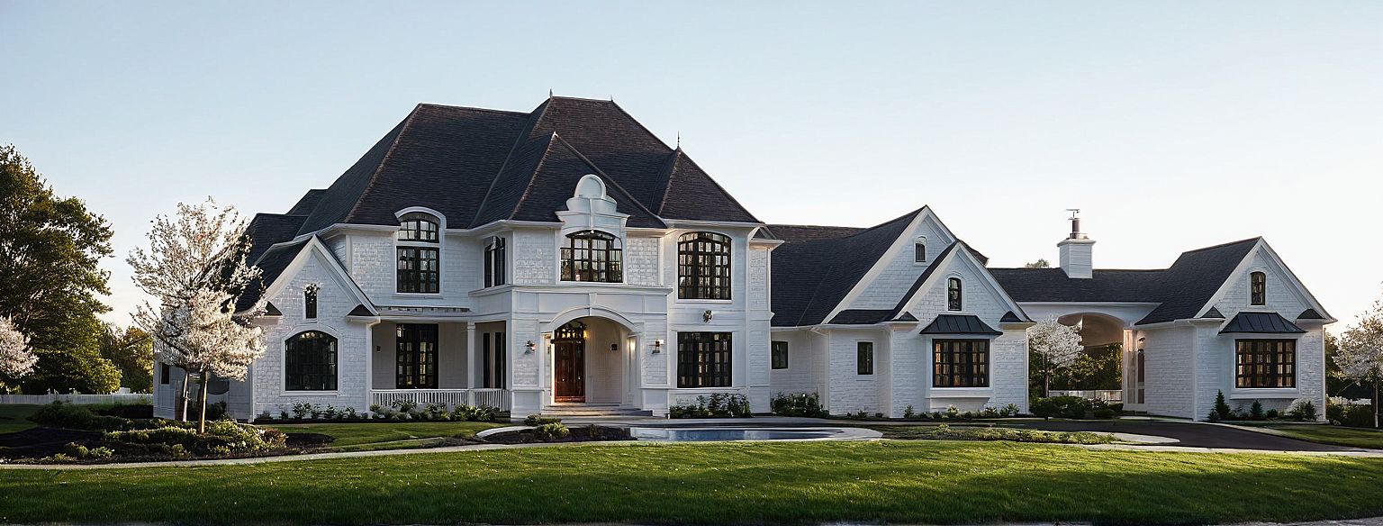 Promptwood shingle style black roof lush lawn and landscaping Belgian block stone fireplace driveway white trim and columns cherry tree in lawn white brackets white windows night view lights on large trees in background pool foreground white railing steps turn all lights in windows lots of small shrub flowers