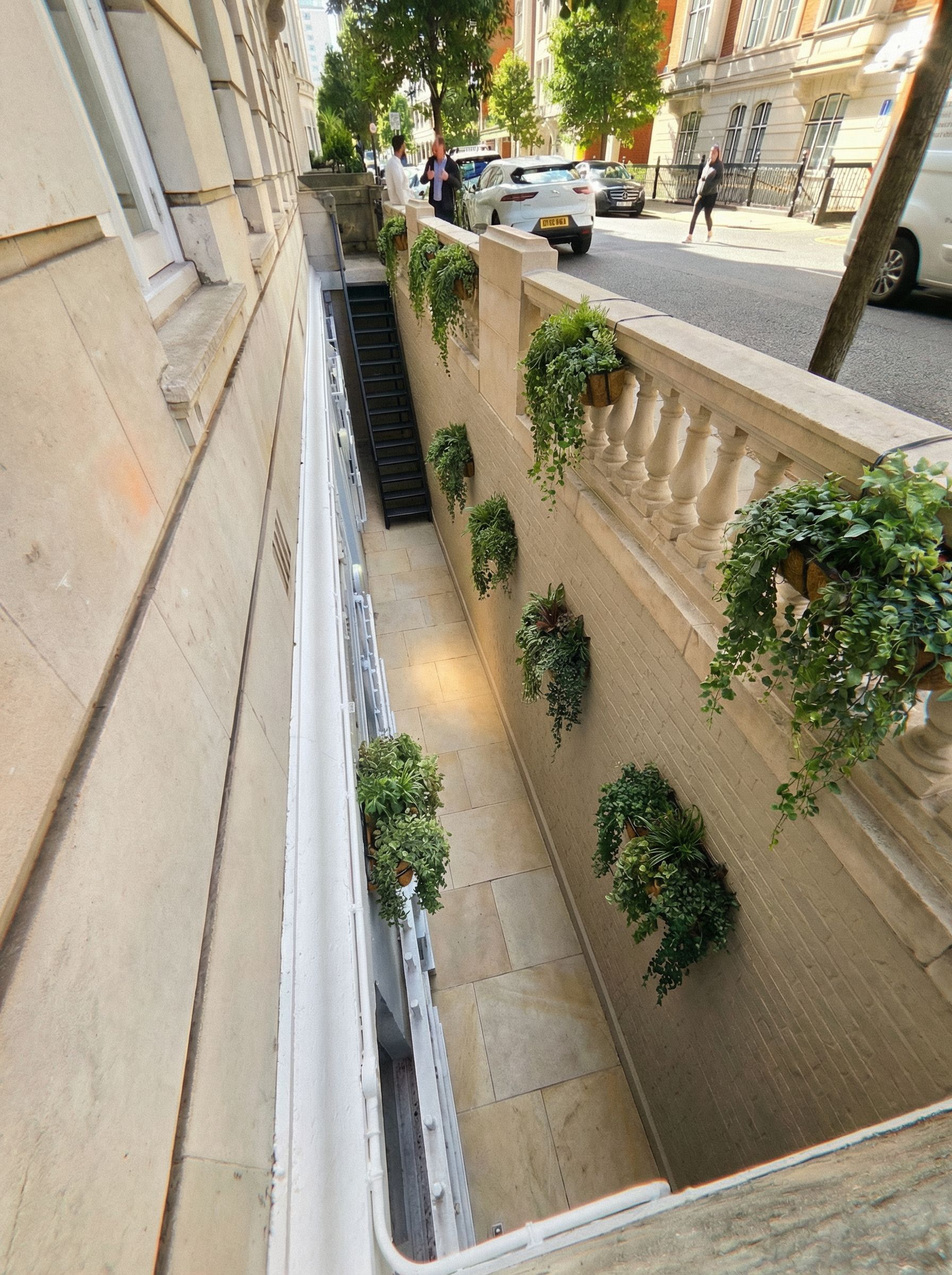 No change to size of lightwell, make lightwell look attractive, with light large scale tiled floor, beige painted brick wall to match stone colour, remove window bars, some hanging planters, remove black pipe in foreground, clean stonework of balustrade, remove airconditioning unit, keep exact camera angle
