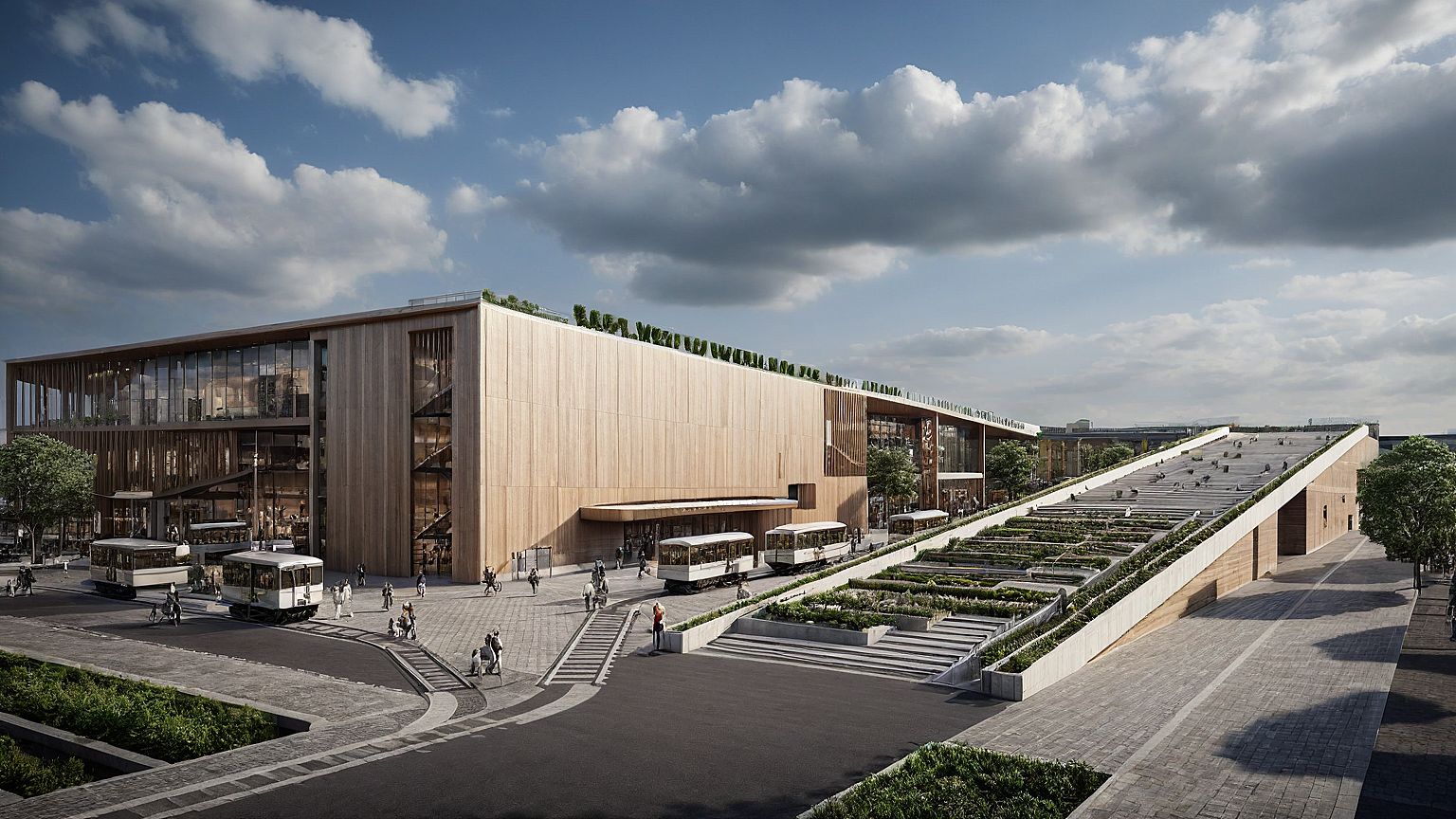 Render and design the facade of this civil building a museum, shopping center, cinema in a social district in the center of the city. Also add greenery where possible. add steeped seating with greenery to the ramp. the train carts are kiosks
