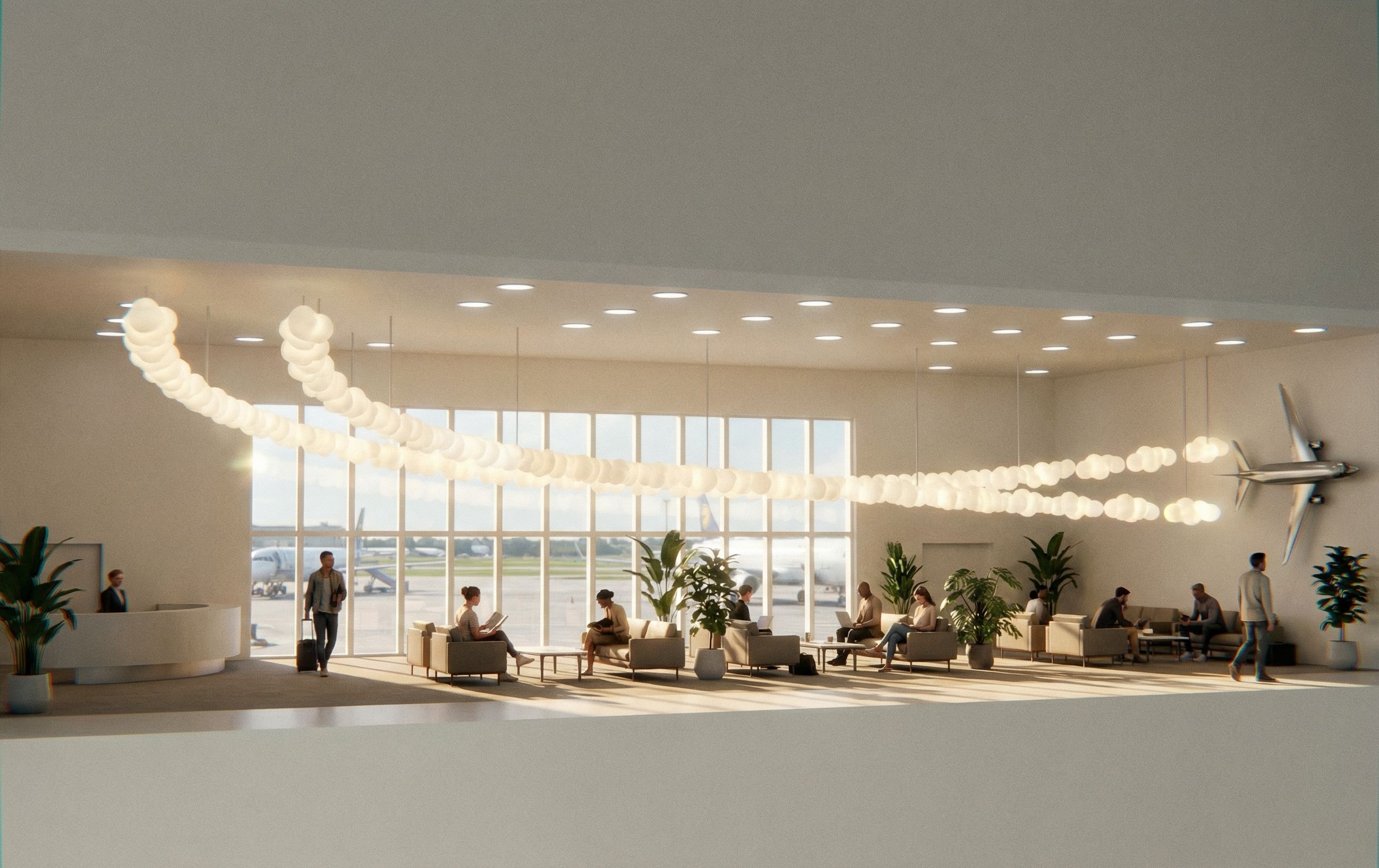 PromptInterior perspective of an airport gate lounge seen in long section. Minimal, monochromatic architecture with a low, smooth white ceiling and a deep rectangular space. A sculptural glowing contrail light fixture made of many soft, cloud‑like luminous spheres sweeps in a graceful parabolic curve from the left foreground across the room to the right, where it connects to a sleek, abstract wall‑mounted airplane. The contrail emits a warm white light and appears volumetric and soft, with subtle bloom. In the ceiling, a regular grid of large 2‑foot diameter recessed round LED downlights provides a secondary, cooler white ambient layer. At the far side, a tall window wall with vertical mullions suggests the airfield beyond, while a simple gate counter and minimal walls keep the composition clean and modern. Camera is placed at eye level, looking across the entire length of the space, with realistic global illumination, soft shadows, and slightly cinematic contrast. High‑resolution, physically based rendering, no people, calm atmospheric mood., keep exact camera angle