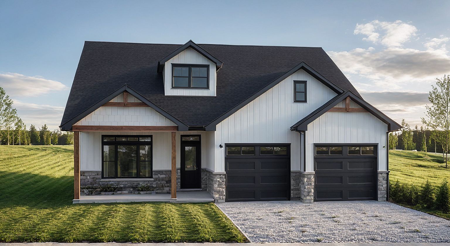 PromptPhoto of a modern single-family home featuring a combination of white siding and stone elements. wood posts and bracket details, flat grass lawn, urban neighbourhood setting