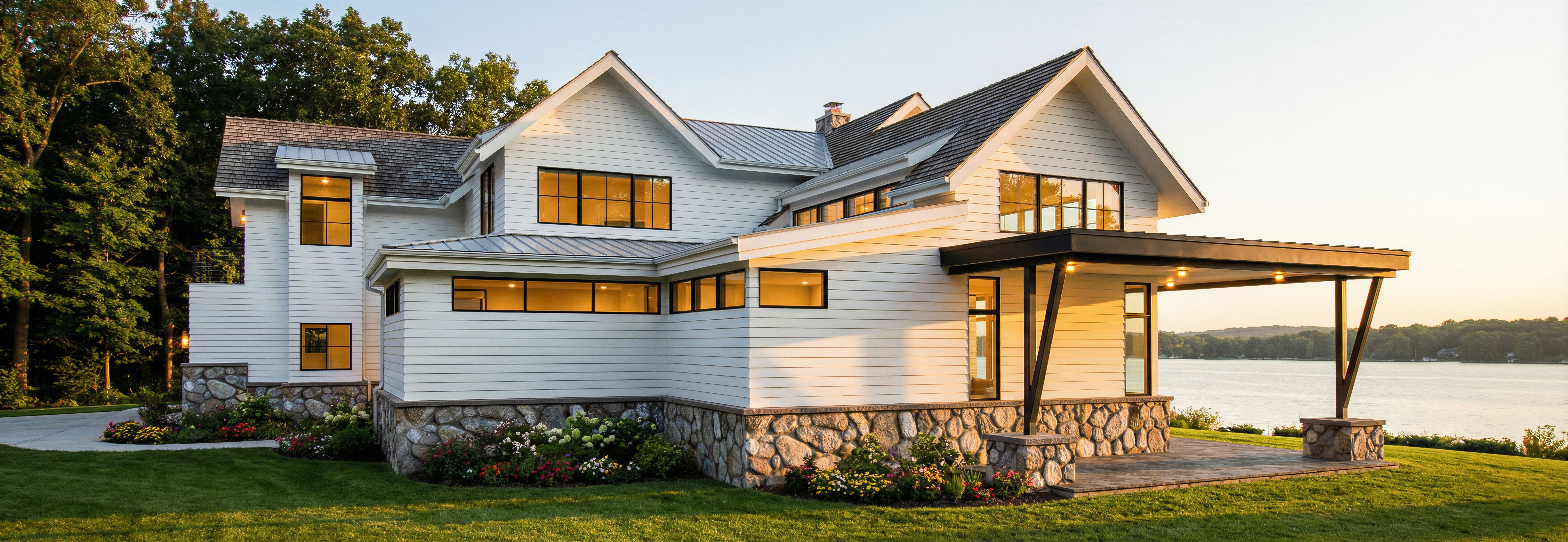 EnhancedPromptMake photorealistic rendering of the house, add lake view on the right in the background per Reference Image 1, add trees on the left behind the house, replace light brown gravel spaces with flower beds, lawn in the front, darker cedar shake roof on the left, lower roofs and roof between two gables is standing seam metal, clean bright white mitered lap siding per Reference Image 2, exterior lights on under the porch roof, light in the interior rooms, keep exact camera angle, keep exact camera angle