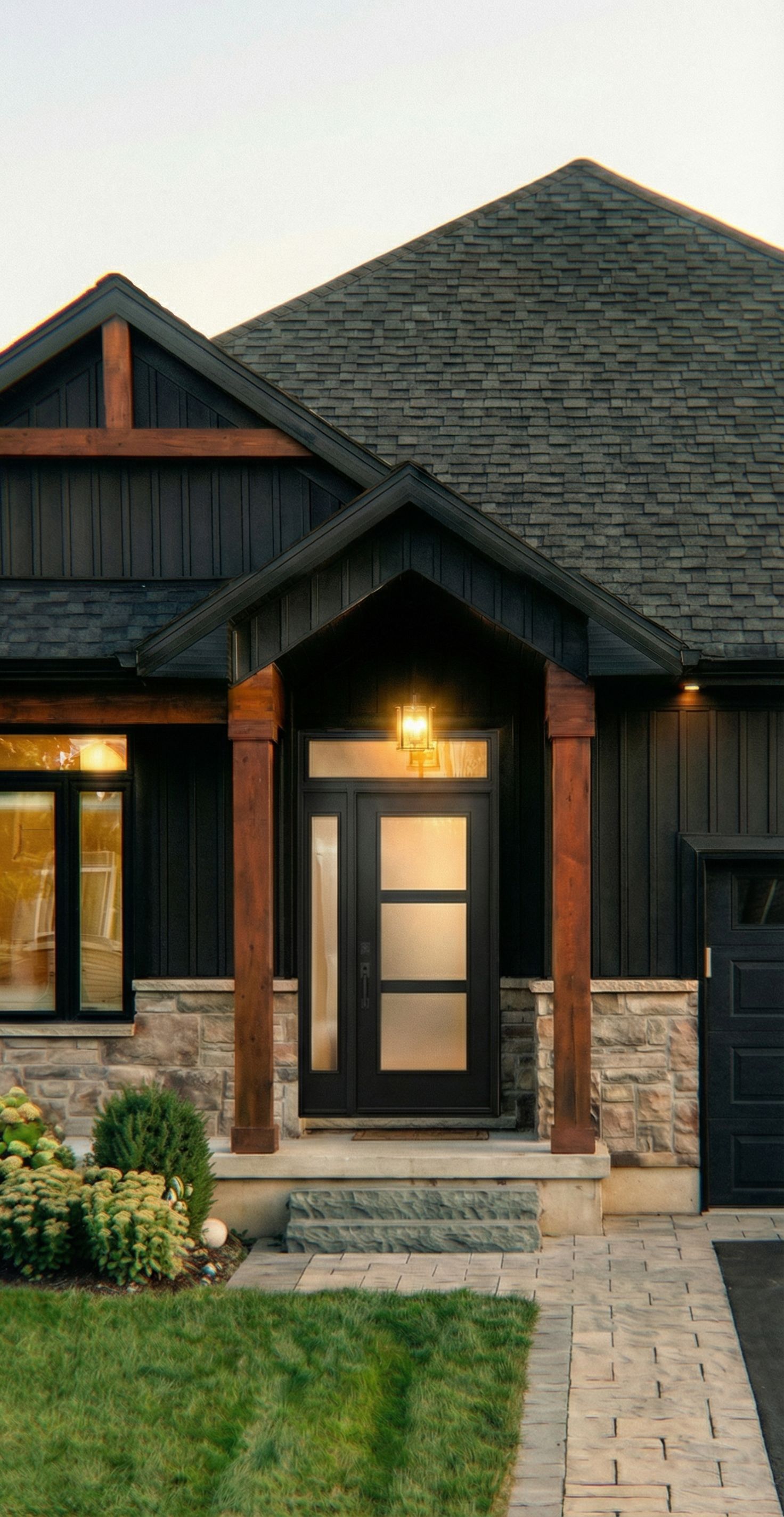 Promptchange the front door to the reference style, black door, with 3 glass sections, frosted glass, with thick black horizontal grills, clear glass side light, and clear transom window glass above, real 4k door, not fake looking, keep exact camera angle