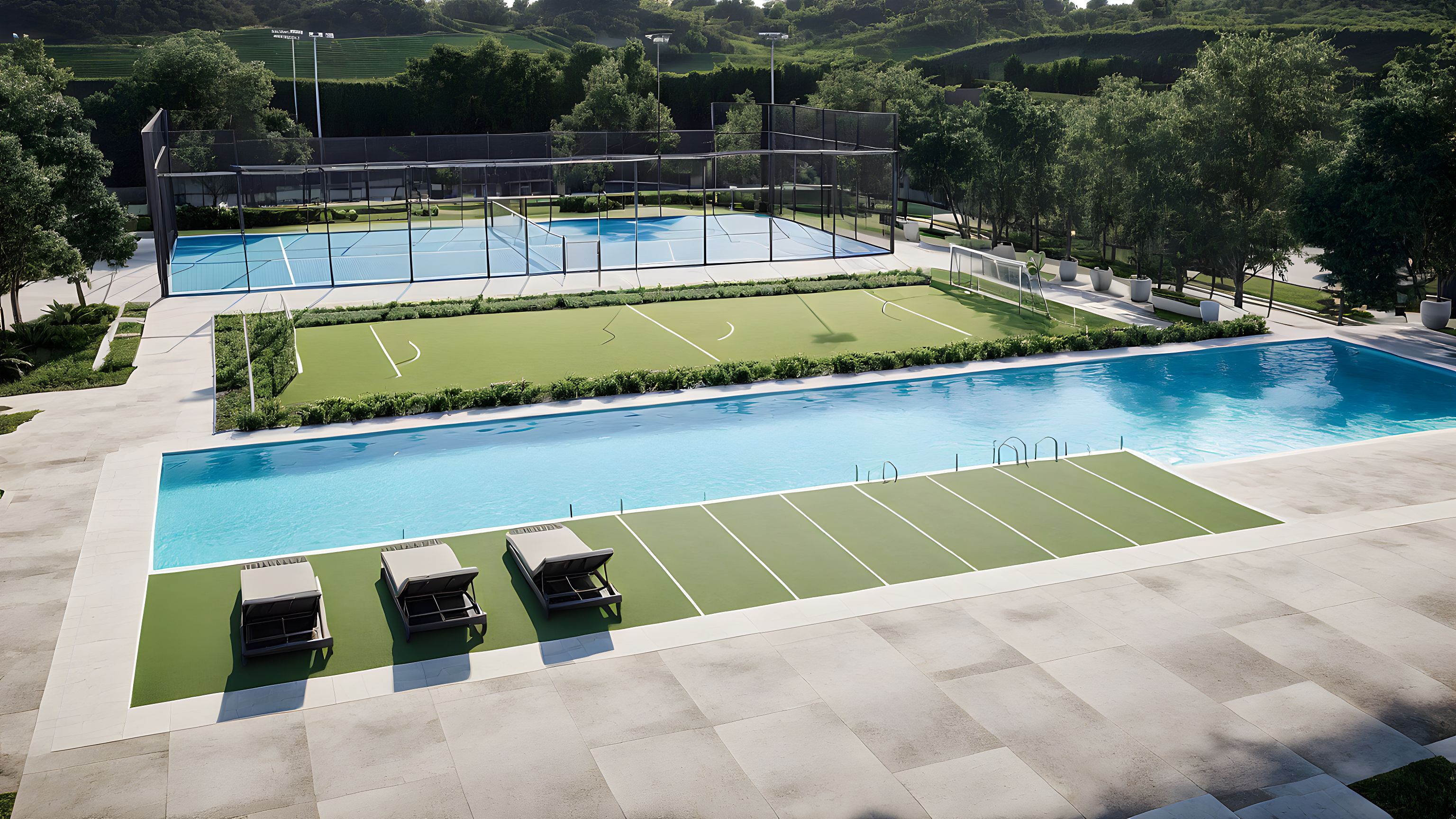 An incredibly lifelike, richly detailed, photorealistic architectural photograph of the amenities in a residential complex with a pool as primary plane, in the middle of image there is a small soccer field an behind it a Padel court Keep the structural, geometry and architectural design of the image