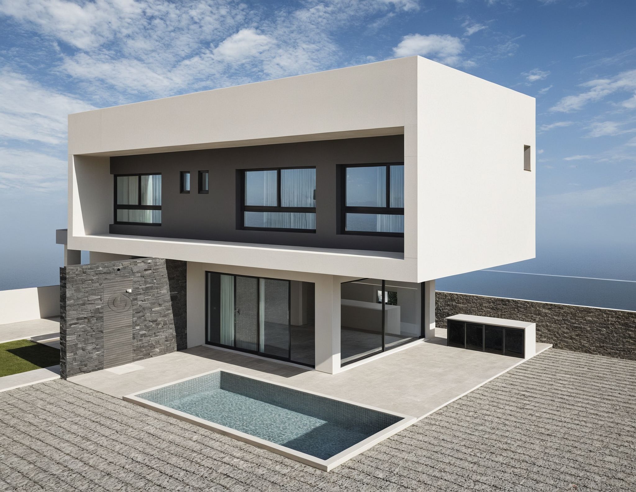 PromptBLACK WINDOWS, FIRST FLOOR GREY HPL, GROYND FLOOR FREE STANDING WALL WITH CREAM STONE, SWIMMING POOL