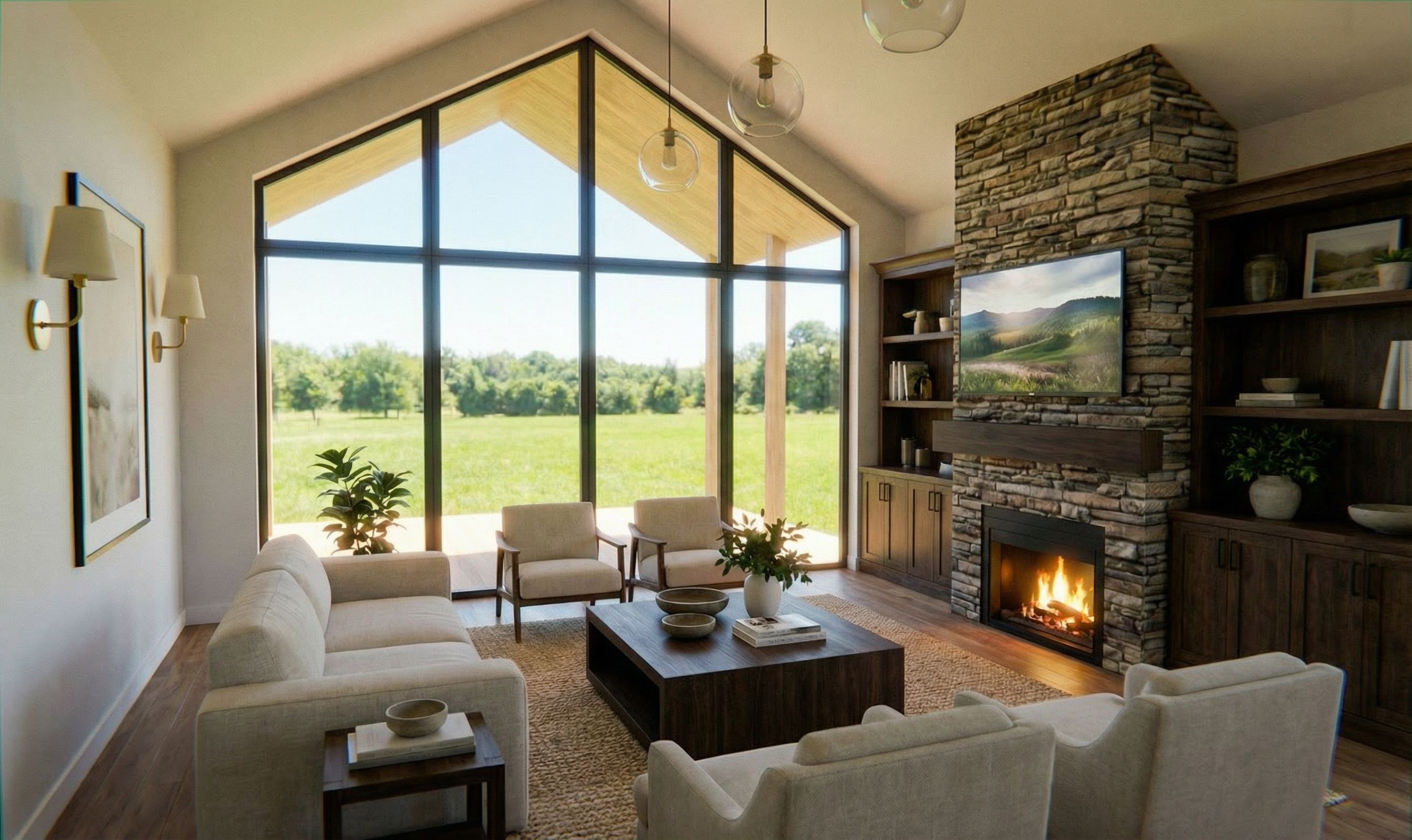 PromptREMOVE THE TWO WINDOWS ON EITHER SIDE OF THE FIREPLACE AND REPLACE WITH MATCHING FURNITURE, SHOW A TV ABOVE THE FIRE, keep exact camera angle