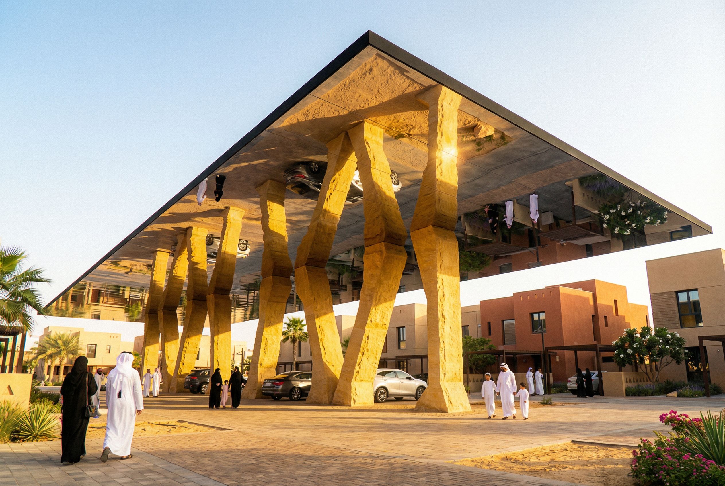 Promptblack is mirror , yellow is stone , add villas same reference image around , saudi families, keep exact camera angle