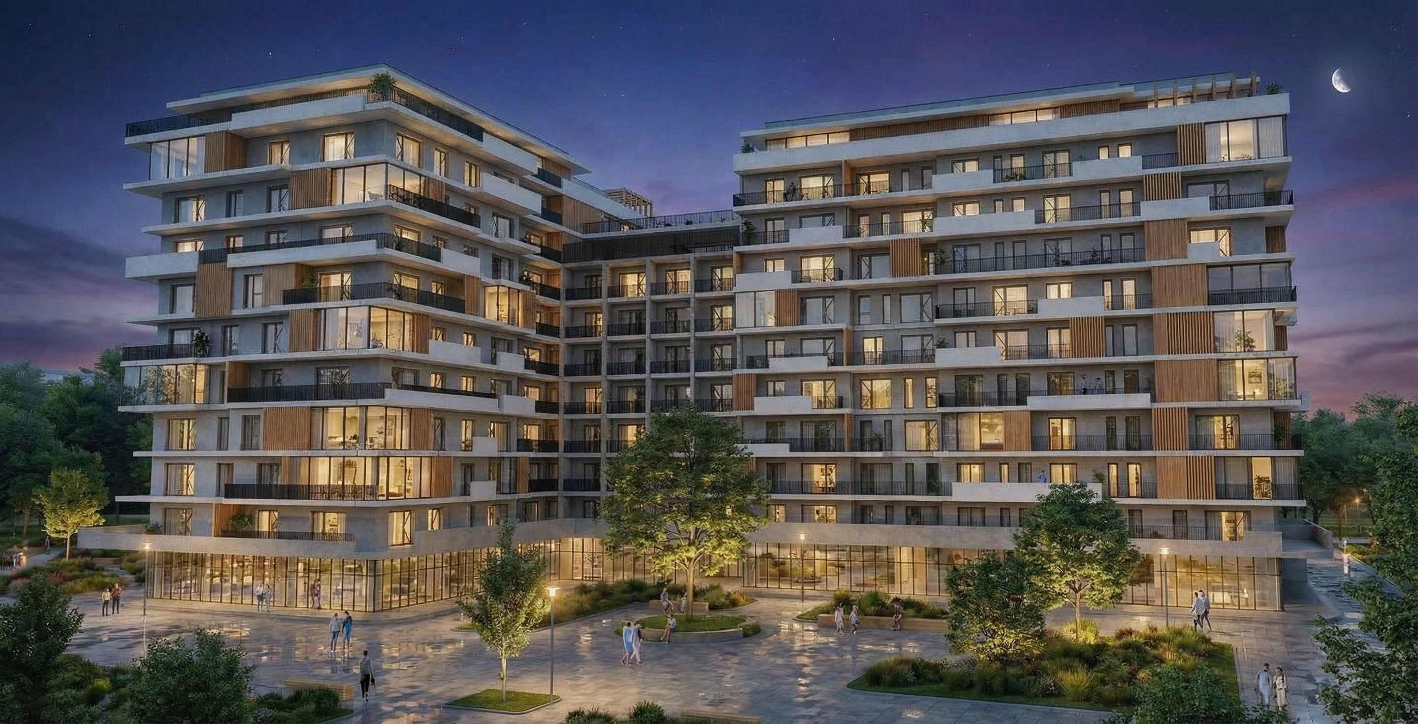 architectural exterior rendering, render this 3D mass into photorealistic rendering, night, near a park, white balcony and grey walls, wood fluted panels, black metal railing. modern design, keep exact camera angle, night scene with ambient lighting, including people, high quality, professional, detailed scene