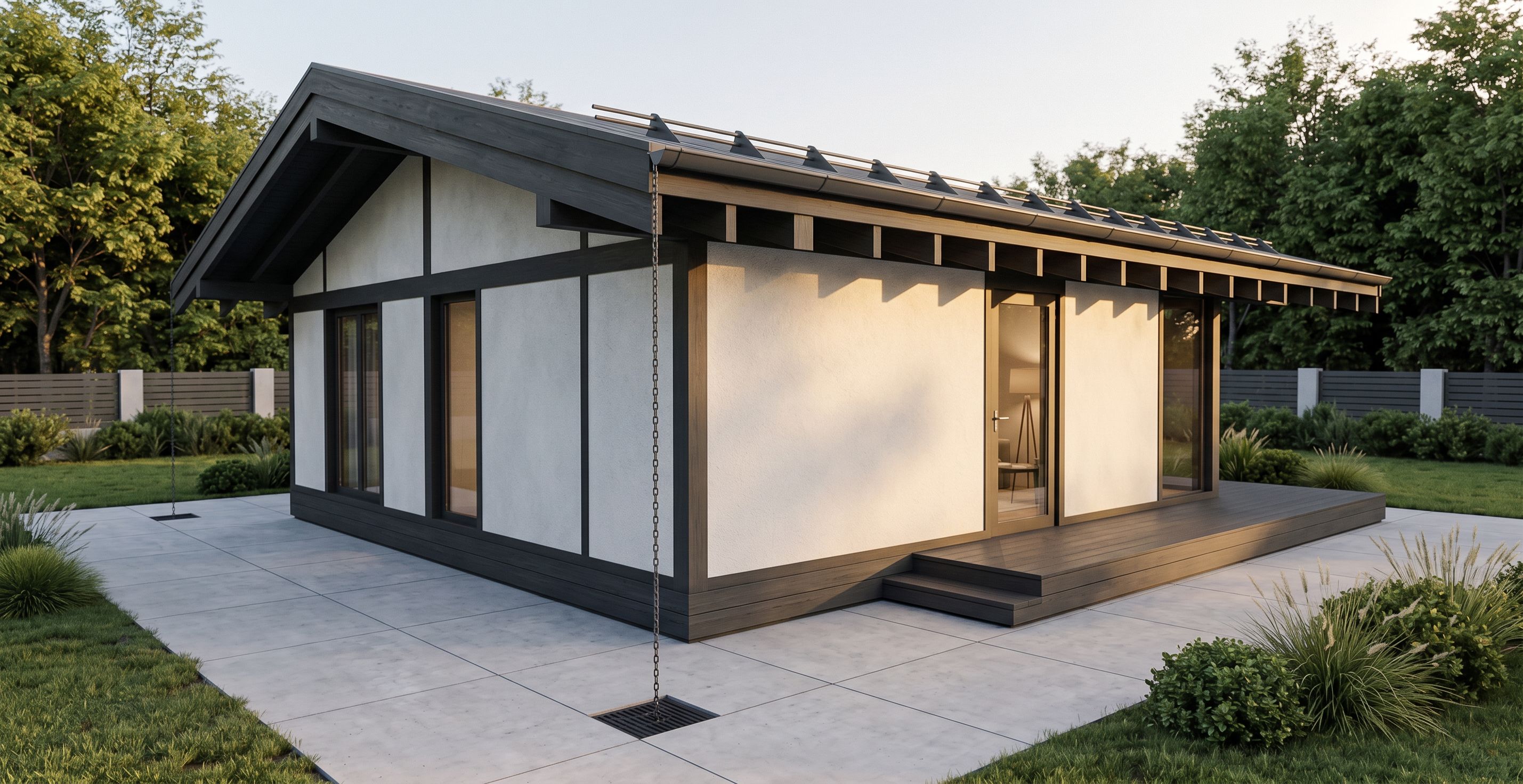 Современный одноэтажный загородный дом в стиле минимализм с элементами скандинавской и японской архитектуры, компактный объём с двускатной крышей и широкими свесами. Конструктивные балки и элементы кровли выполнены в цвете тёмный графит. Фасад с тёмным каркасом и светлыми панелями. Терраса из дерева в цвете серый графит интегрирована в уровень участка, без видимых свай и опор. Небольшая ступень аккуратно соединяет террасу с плиточным покрытием. Вокруг дома — крупноформатная бетонная плитка светло-серого цвета, аккуратные швы, минималистичный ландшафт. Участок с газоном, кустами и злаками, по периметру забор и густые деревья. Цепь водостока направлена в скрытый дренаж в плитке, без камней. Без автомобиля, чистая архитектурная сцена. Освещение — мягкий тёплый дневной свет, golden hour. Камера: трёхчетвертной боковой ракурс, акцент на вход и геометрию фасада, объектив 35mm., keep exact camera angle