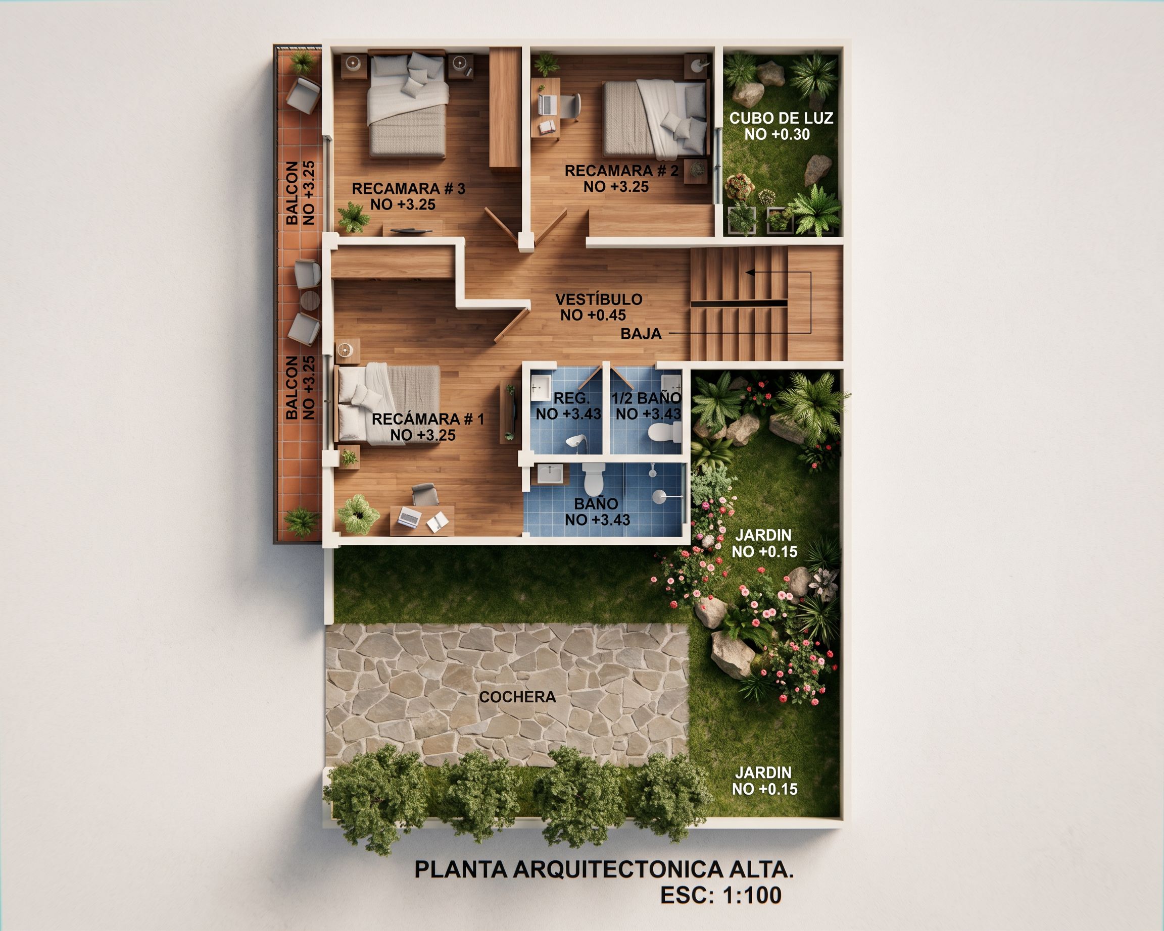 PromptPLANTA ALTA HIPERREALISTA, RECAMARAS CON PISO DE MADERA, VESTIBULO CON PISO DE MADERA, CUBO DE LUZ CON PASTO NATURAL Y ALGUNOS MACETEROS, ESCALERA CON PISO DE MADERA, BAÑOS CON PISO DE AZULEJO COLOR AZUL, JARDINES CON PASTO ALGUNAS ROCAS Y VEGETACION VARIADA, ASI COMO PLANTAS DE ROSAS, LA COCHERA CON PISO DE PIEDRA NATURAL. BALCON CON LOSETA DE BARRO. DONDE DICE REG. ES UNA REGADERA CON LAVABO EN ESA AREA., keep exact camera angle