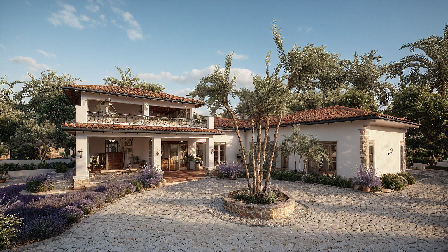 PromptHyper-realistic render of a Mediterranean-style bungalow with terracotta roof tiles, white stucco walls, arched windows, wooden shutters, and a stone-paved patio. Surrounded by olive trees, lavender bushes, and a sea view in the background. Golden hour lighting, realistic shadows and reflections, 8k resolution, cinematic composition, ultra-detailed textures
