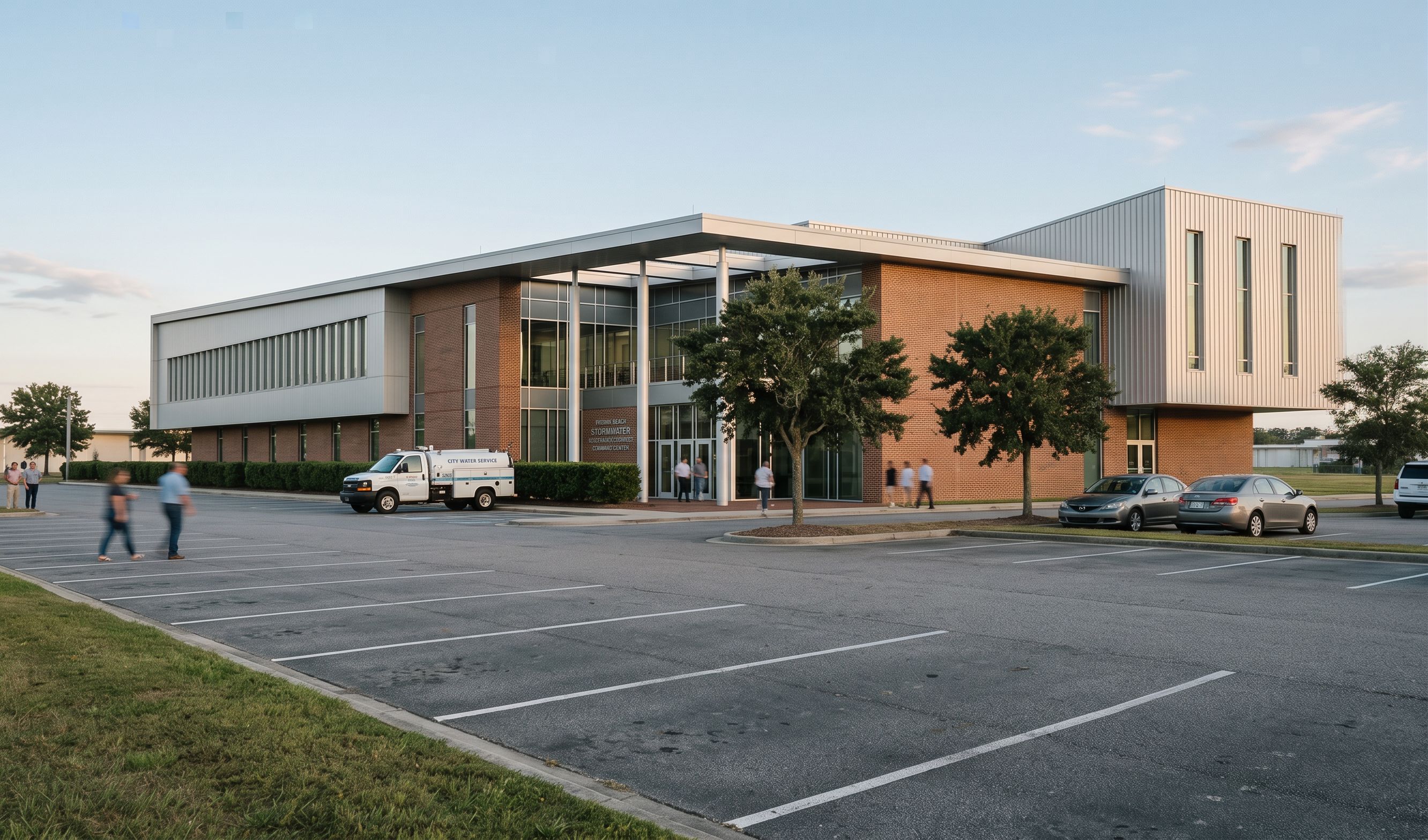 PromptThis is a stormwater operations control command center in virginia beach. Please render the base image with the same view and proportions. Do not change any materials, keep the brick as brick, and the metal as corrugated metal. Do not add addition mullions that are not there. Lighten the metal corrguated a little bit, and make the spandrel glass a bit more gray to match the aluminum metal panel. Try to get the proportions back to the orginal base image, it seems like its getting skewed a bit. Also make the aluminum metal panel less blue and lighter. Bring the spandrel panel a bit closer to the front edge of the storefront frame so there isnt such a deep shadow where those mullions are. Only add mullions where they show up in the base image., keep exact camera angle