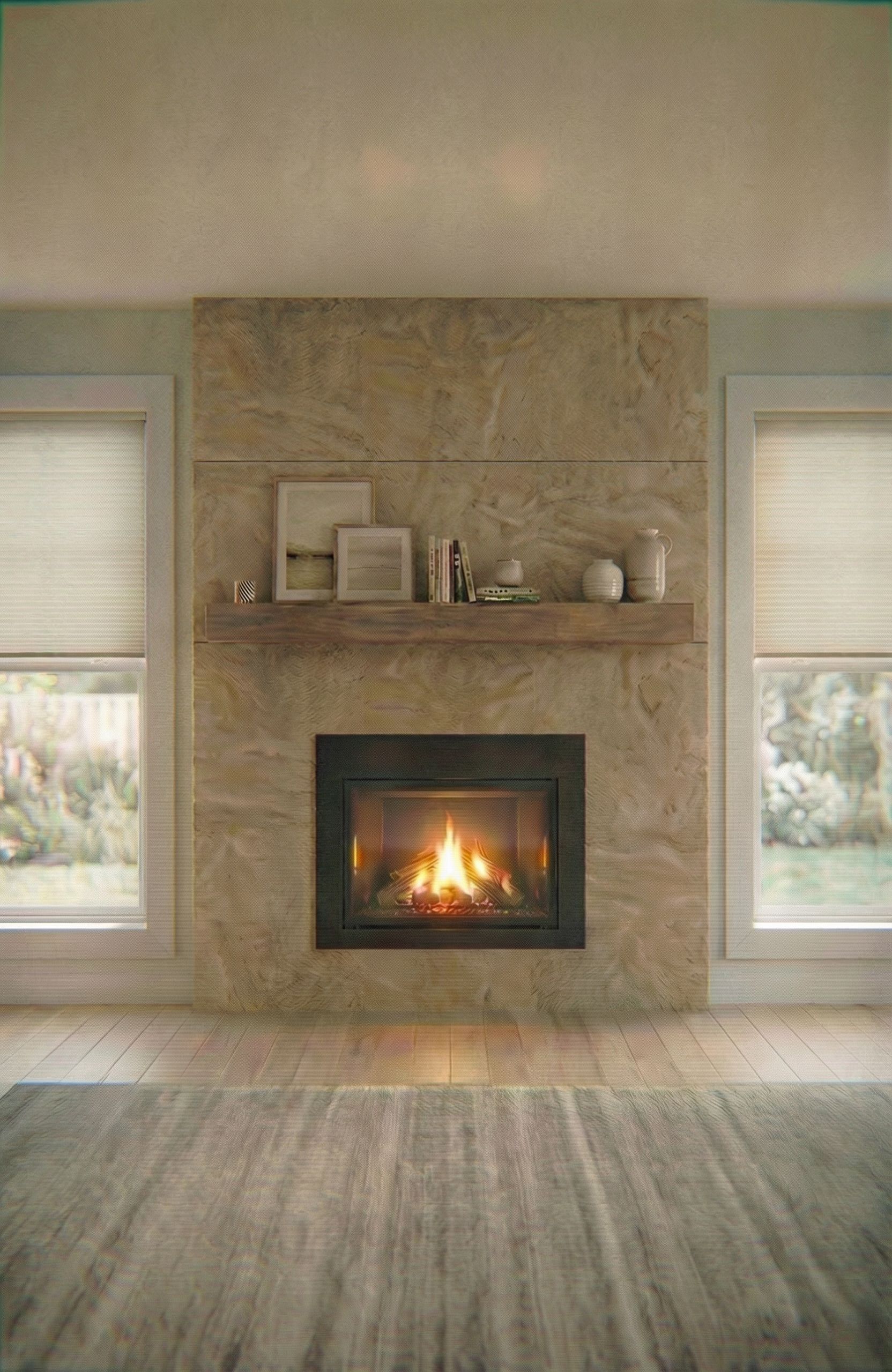 keep everything exactly the same but add 1 horizontal grout line behind the mantle . keep the two vertical grout lines as they are , keep exact camera angle