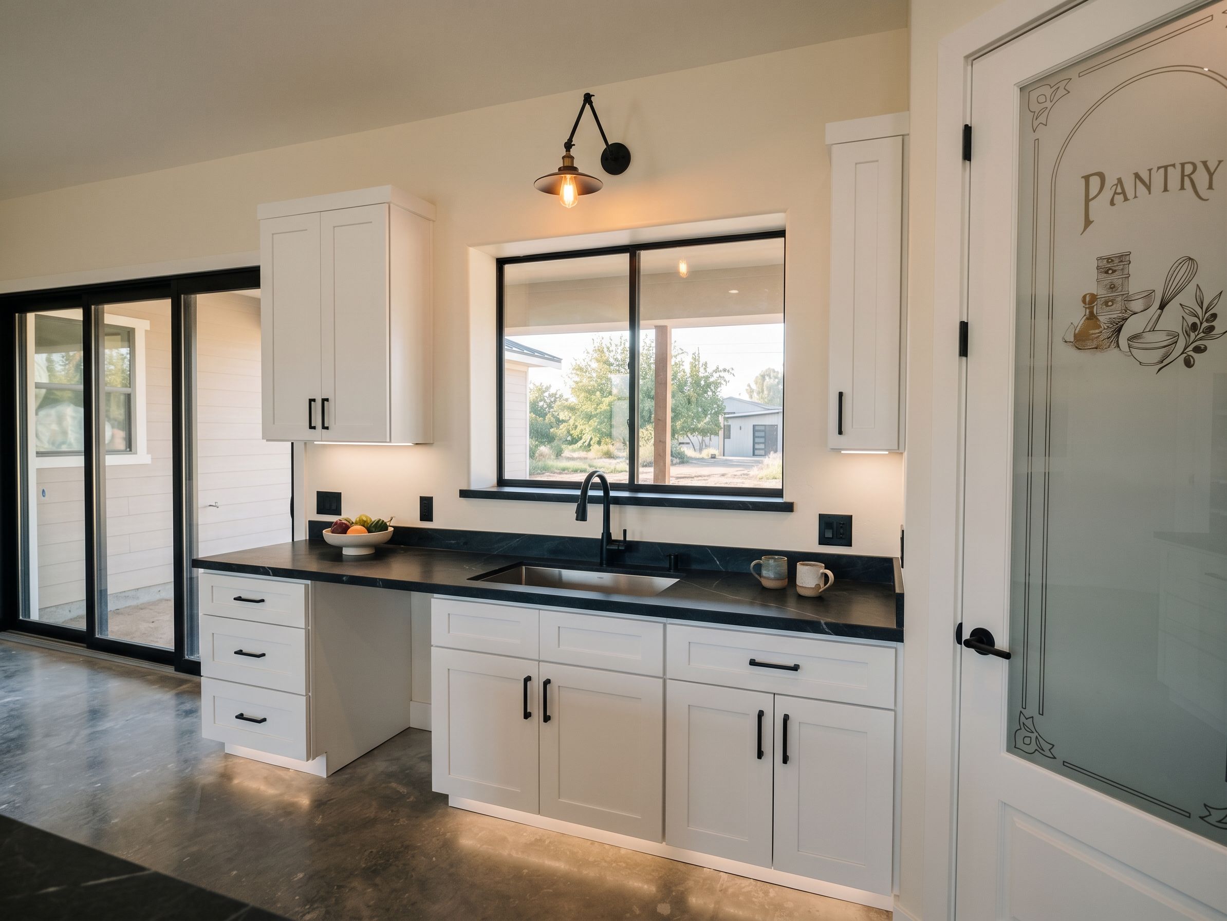 Promptremove ceiling spot light above sink, add black gooseneck light on wall above sink, keep exact camera angle