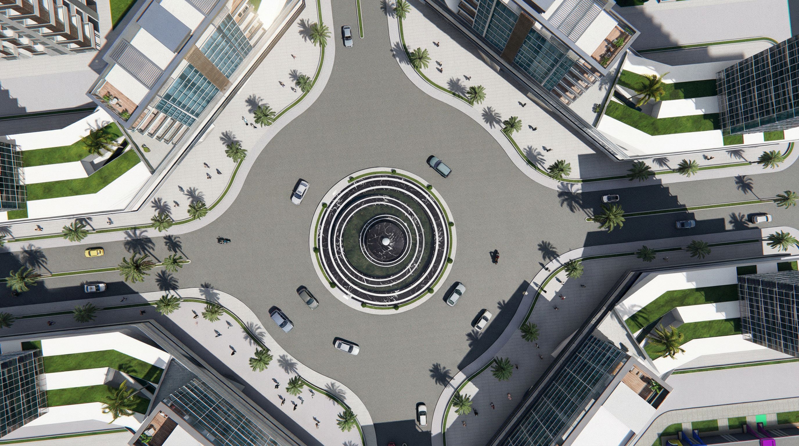 PromptPhoto of a modern urban intersection featuring contemporary residential buildings. Emphasize sleek architectural lines, large glass facades, and green rooftop gardens. Surrounding the roundabout are palm trees and well-maintained pavement. Bright daylight enhances the scene, casting intricate shadows and highlights. Capture a bird's-eye view for a wide perspective, showcasing the circular traffic design and surrounding structures, while using a standard lens for clarity and detail. don't add architecture or trees on the rooftops, keep exact camera angle