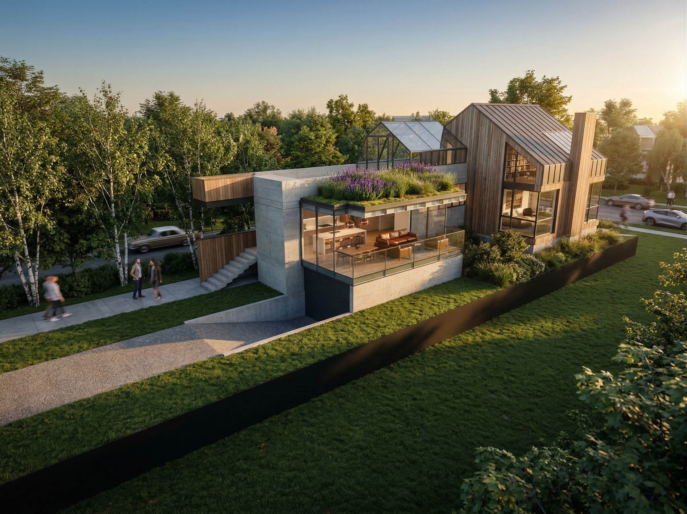 PromptPhoto of an architectural residential complex featuring multiple modern buildings with distinct designs and materials, situated in a lush urban environment. Emphasize the clean lines, varying roof styles, and connections to outdoor spaces. Surrounding landscapes include manicured lawns and nearby trees, creating a serene atmosphere. The lighting captures a late afternoon sun, casting gentle shadows and warm highlights on the structures. Perspective from a slightly elevated angle with a wide lens to portray the layout and relationship between buildings, highlighting the inviting pathways and community feel., keep exact camera angle
