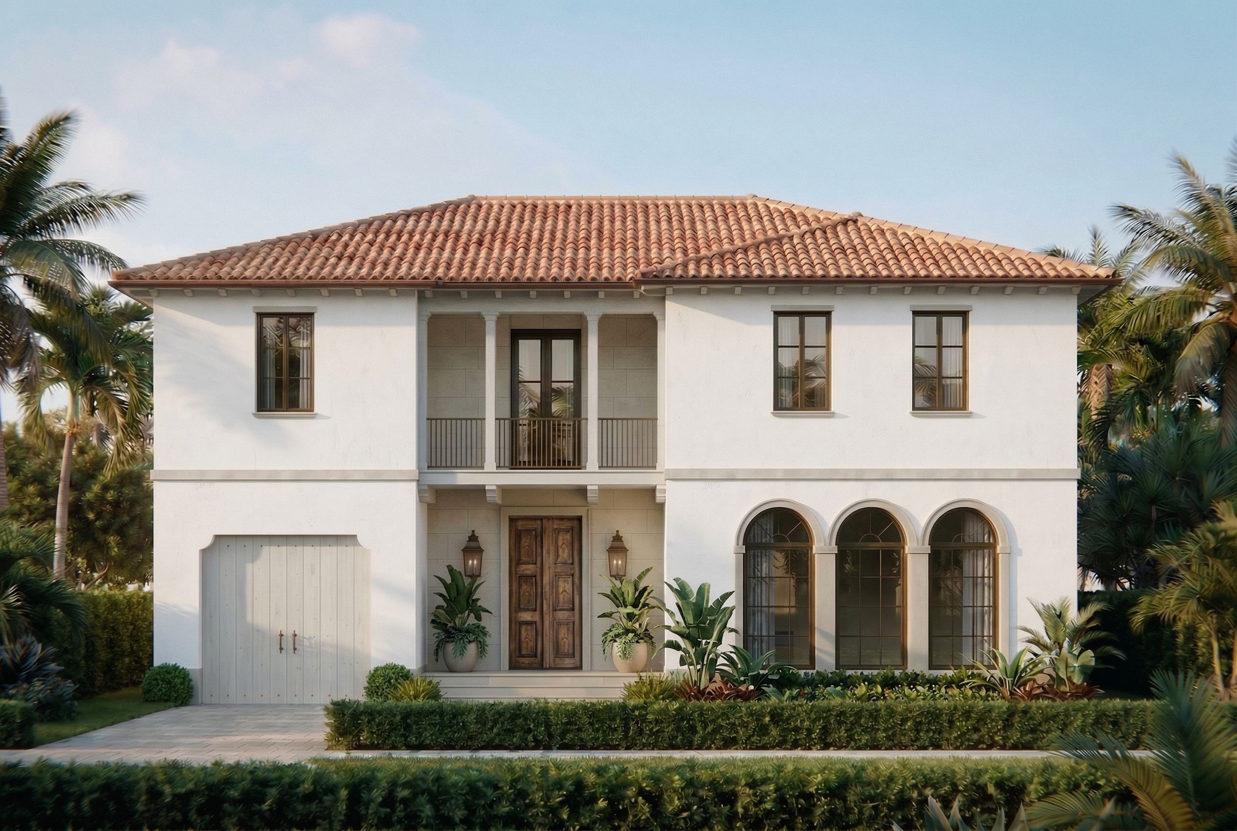 Regenerate the provided image into a highly photorealistic architectural rendering. CRITICAL: - Do NOT change the architecture, massing, proportions, openings, or roof form. - Do NOT crop, zoom, or alter the camera view. - Use the exact geometry from the input image. - This should be a full regeneration, not a light enhancement. LIGHTING: - Bright, natural daylight NOT golden hour - Clean, neutral lighting with soft shadows - All surfaces should be clearly and evenly lit - Avoid warm/yellow color cast MATERIALS VERY IMPORTANT: STUCCO: - Main body must read as a TRUE WHITE stucco - Slightly warm but clearly white not cream, not beige - Smooth matte finish with subtle texture WOOD ELEMENTS Garage door, columns, beams, rafter tails: - Lime-washed cypress - Very desaturated, pale tone - Lean slightly grey NOT orange, NOT yellow - Minimal visible grain, soft and refined STONE ELEMENTS: - Includes: horizontal band, window/door surrounds, headers, sills, steps, front door wall panels, AND balcony wall panels - Light natural stone tone that complements the limewashed cypress - Slightly lighter and softer than typical limestone - Maintain subtle contrast with stucco STONE PANEL AREAS FRONT DOOR WALL + BALCONY WALL: - Must clearly read as stone panels not stucco - Include refined horizontal joints - Joints should be visible but subtle not oversized or dramatic - Panel scale should feel proportional and high-end METAL ELEMENTS: - Railings, window frames, and fixtures: dark bronze - Add a VERY subtle hint of deep olive tone - Matte to low-sheen finish not glossy black FRONT DOOR: - Wooden 6-panel door - Rich, natural wood tone that complements the limewashed cypress - Mediterranean character, not overly dark, not red/orange ENTRY FEATURE VERY IMPORTANT: - Increase the scale of the front porch light fixtures - Fixtures should feel oversized relative to the entry to create a grand presence - Style: refined Mediterranean / traditional lanterns - Dark bronze finish to match metal elements - Entry should feel elevated, intentional, and visually important despite small footprint ROOF: - Maintain terracotta tile - Reduce saturation slightly so it feels natural and not overly orange - Add realistic depth and shadow between tiles LANDSCAPING: - Fully regenerate landscaping - High-end, refined Palm Beach front yard - Structured, elegant, and intentional not overgrown - Layered planting: low hedges, tropical greenery, clean composition - Add large, sculptural potted plants flanking the front door - Keep it soft but upscale and architectural ENVIRONMENT: - Palm Beach, Florida context - Lush but controlled tropical vegetation in background - Clean sky, natural blue, not dramatic RENDER QUALITY: - Strong material realism with depth and subtle variation - Soft reflections in glass - Avoid flat or cartoon-like output GOAL: Create a bright, refined, high-end Palm Beach residential rendering with a visually elevated and grand-feeling entry, accurate materials, and a cohesive, elegant atmosphere while keeping the architecture completely unchanged., keep exact camera angle