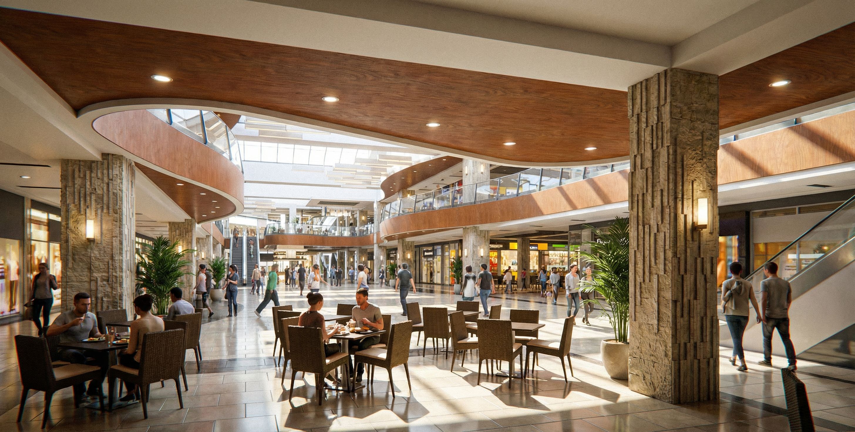 PromptPhoto of a contemporary commercial mall interior, featuring curved wood-accented ceiling elements and sleek glass railings. The spacious atrium includes textured stone pillars and minimalist furniture arranged in a casual dining area. Natural light floods the space through large windows, casting dynamic shadows on the polished tile floor. Captured from a low angle to highlight the grandeur of the open layout, using a wide-angle lens to encompass the bustling atmosphere and flowing movements of shoppers throughout the vibrant retail environment., keep exact camera angle