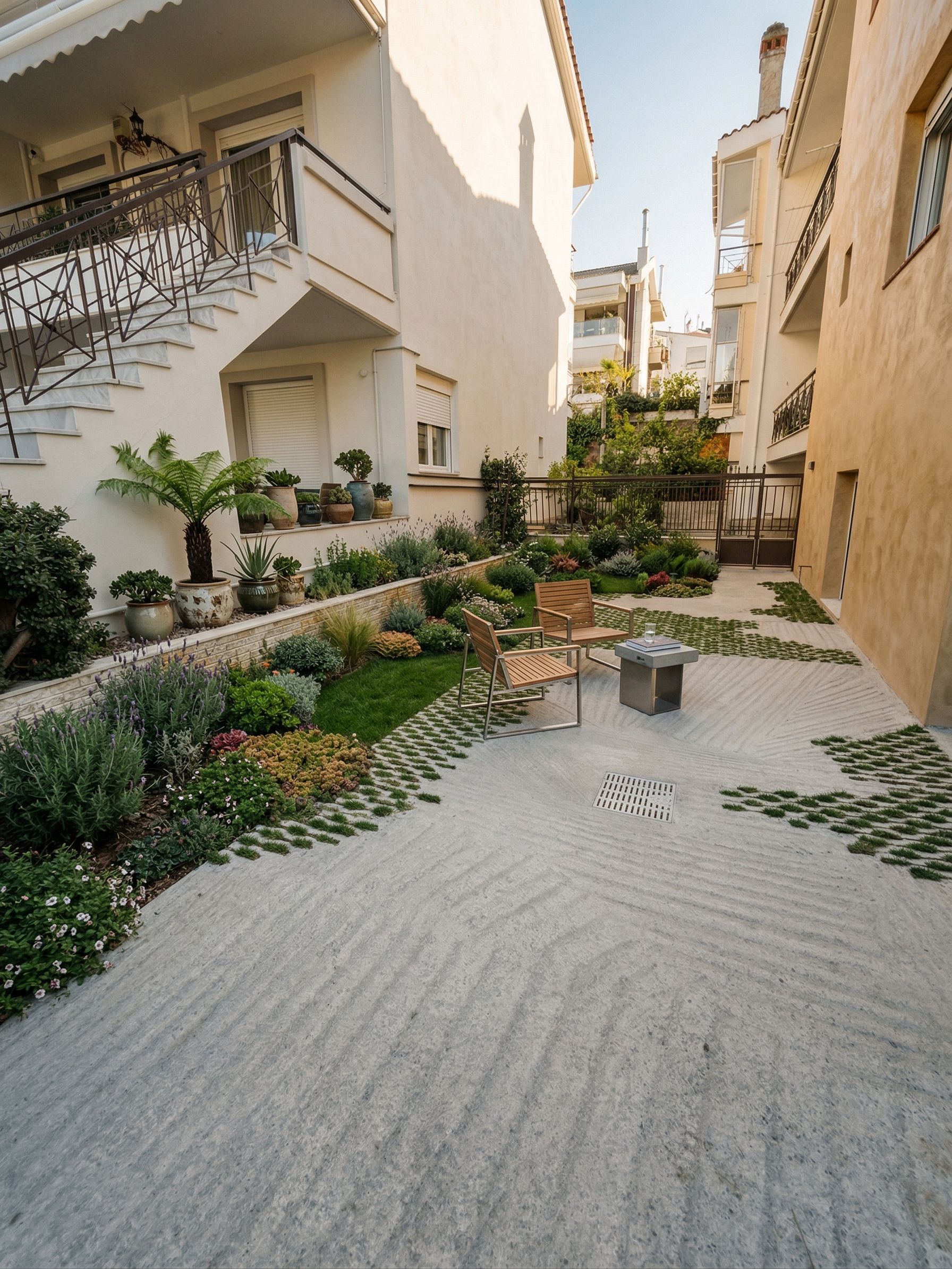 create a beautiful exterior garden with furniture and a little grass. , keep exact camera angle, keep exact camera angle