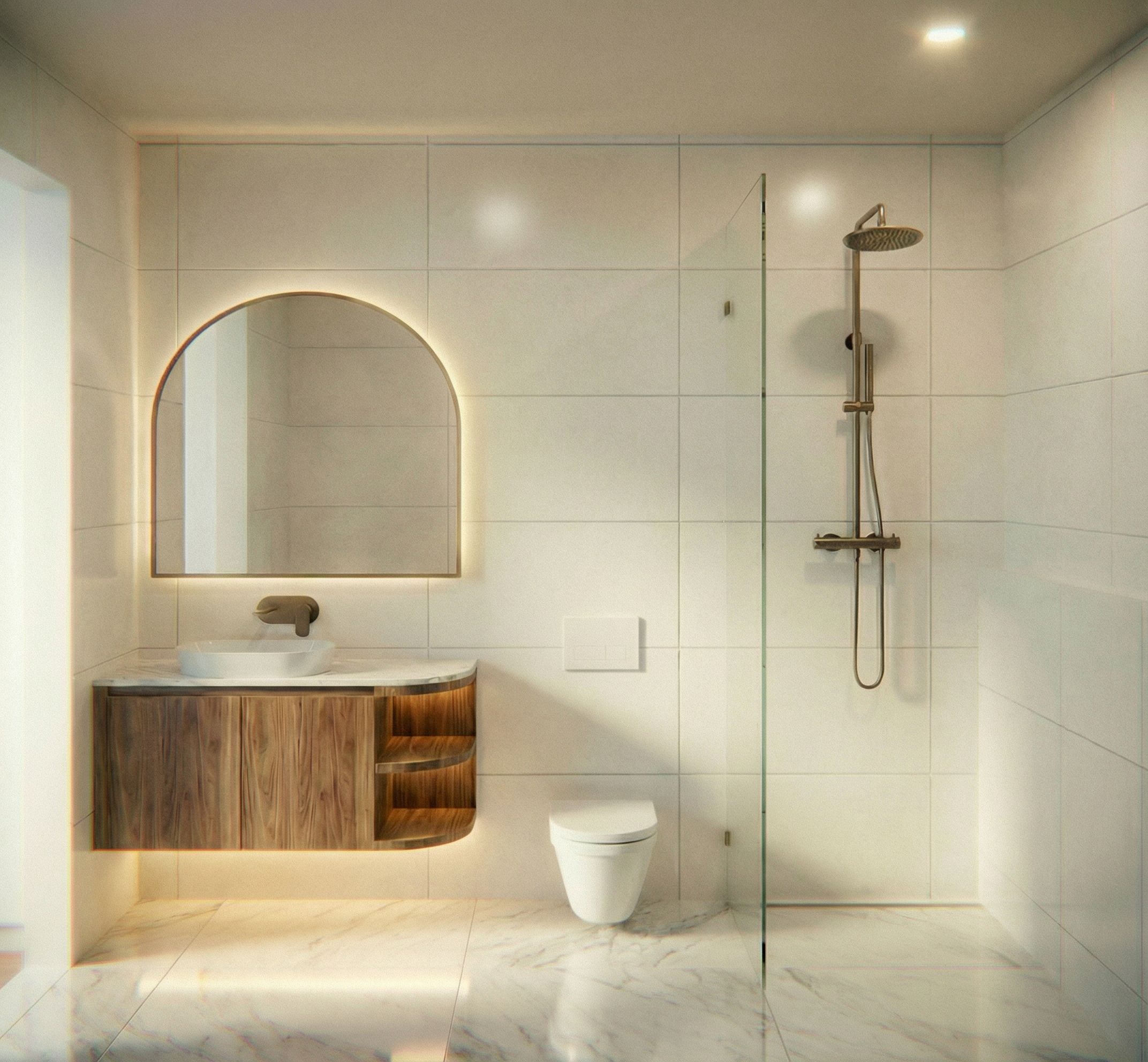 Add strip lighting under vanity, keep exact camera angle