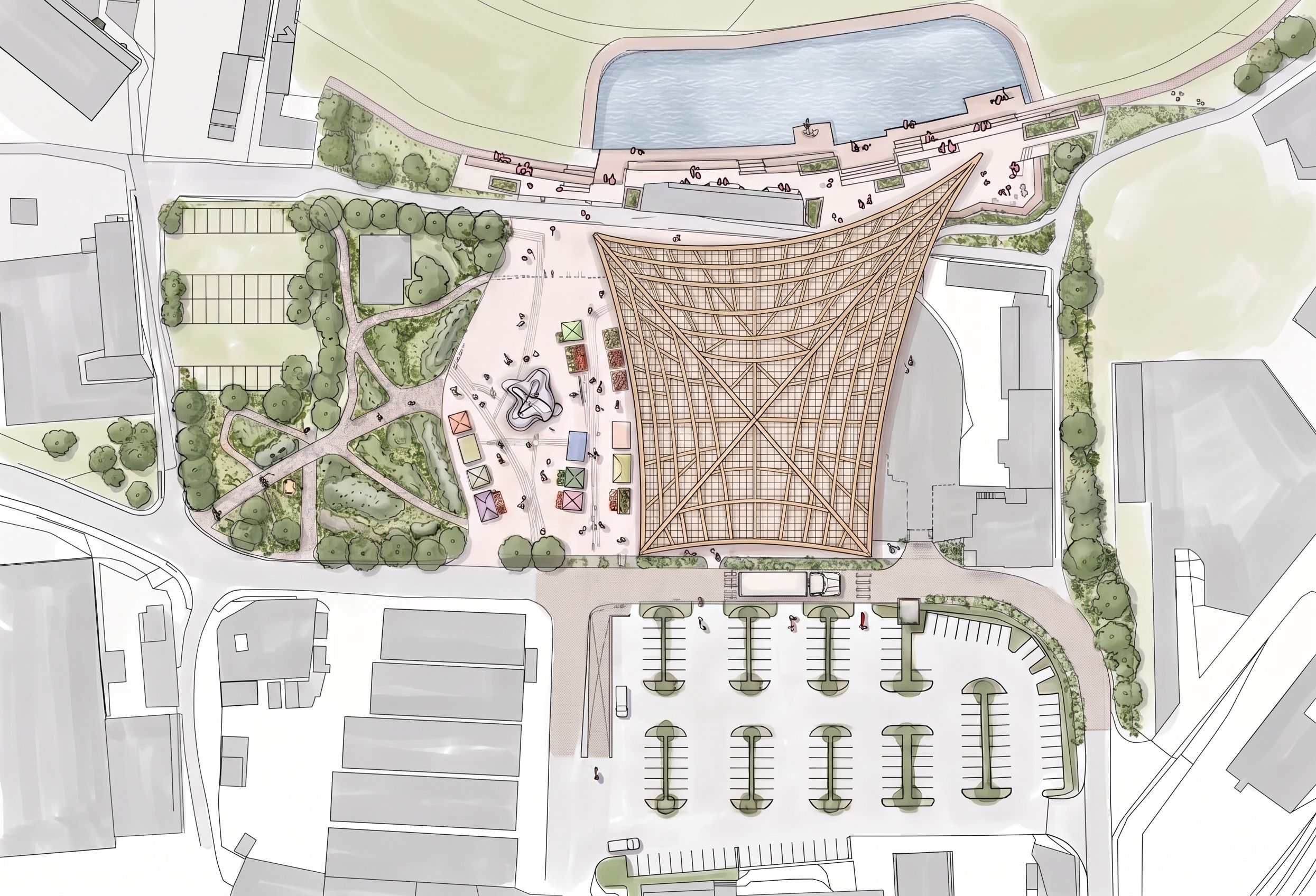 PromptEdit the provided site plan. Keep all buildings, geometry, layout, and overall composition exactly as they are. Do not modify the form or position of the main building or surrounding structures. Remove ALL text labels, annotations, arrows, and descriptions. Adjust the water feature: instead of a continuous river strip, create a bay (zátoka) centered at the top of the site. The water should be localized only in this central recessed area. On both the left and right sides of this bay (top left and top right), replace the water with park landscape (greenery, paths), so the water is only in the middle and land continues on both sides. Keep the connection to the waterfront logical and integrated with the surrounding public space. Modify the service (delivery) access: create a horizontal delivery route running along the bottom edge of the main building, directly adjacent to its rear façade, connected to the road. Keep the employee parking below and clearly connect it with paths and access roads. Indicate the roof structure above the building as a wooden beam system — subtly suggest a grid or pattern of timber beams in the roof area (top view), without changing the building shape. This should read as a light structural texture, not a solid fill. Maintain all landscape areas (park, marketplace, promenade) and ensure clean, logical connections. Style: clean architectural site plan ilustration, minimal, precise linework, soft colors, no text....the water is only on the upper right site not on the left, make it more like a drawing , keep exact camera angle