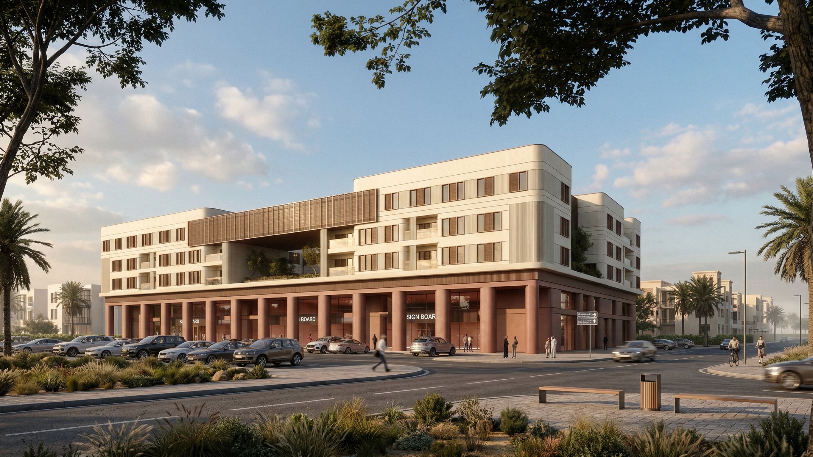 PromptEnhance the realism and overall visual quality of this architectural render while strictly preserving the building design exactly as it is. Do not modify the building’s geometry, proportions, materials, or any fine architectural details. Improve lighting, shadows, reflections, and textures to achieve a highly photorealistic result. Use natural sunlight typical of Al Ain, UAE, with warm tones, realistic sky, and subtle atmospheric haze. Refine and beautify the surrounding environment while keeping the existing road layout exactly unchanged. You may redesign or replace the surrounding buildings with more aesthetically pleasing, context-appropriate architecture typical of Al Ain, including low- to mid-rise buildings, desert landscaping, palm trees, and clean urban elements. Enhance ground materials such as asphalt, pavements, and curbs with realistic texture detail. Add natural environmental elements like soft shadows, subtle weathering, realistic reflections, and balanced color grading. Maintain the same camera height, angle, and perspective direction, but slightly increase the camera distance (zoom out / pull back) to reveal more of the surrounding context. Preserve the original image aspect ratio and framing consistency. The final result should look like a high-end professional architectural photograph, with strong realism, natural lighting, and a well-integrated environment., keep exact camera angle