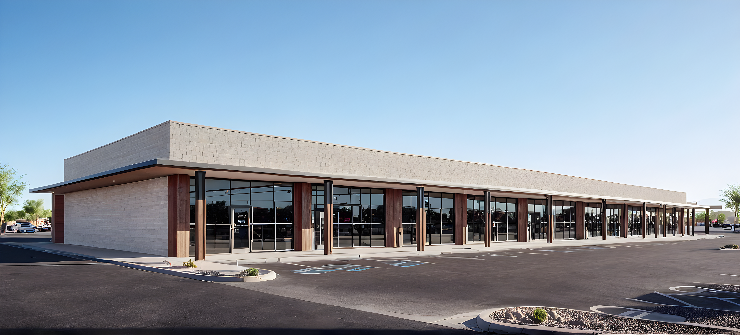 PromptArchitectural visualization of a strip mall in Phoenix, Arizona, clear sunny sky mood.