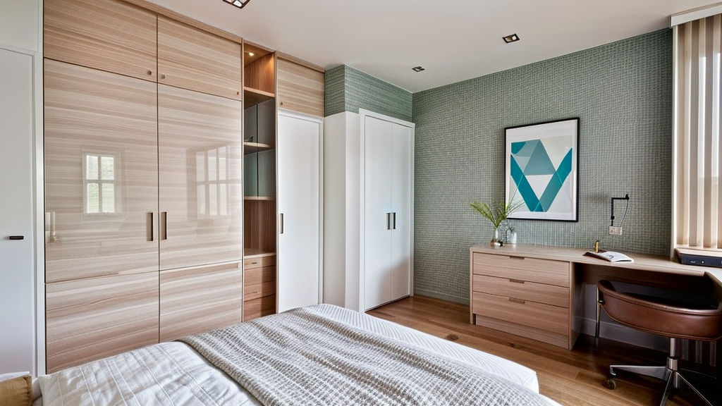 Promptbedroom, natural light, light colors, wood and white furniture, modern and clean