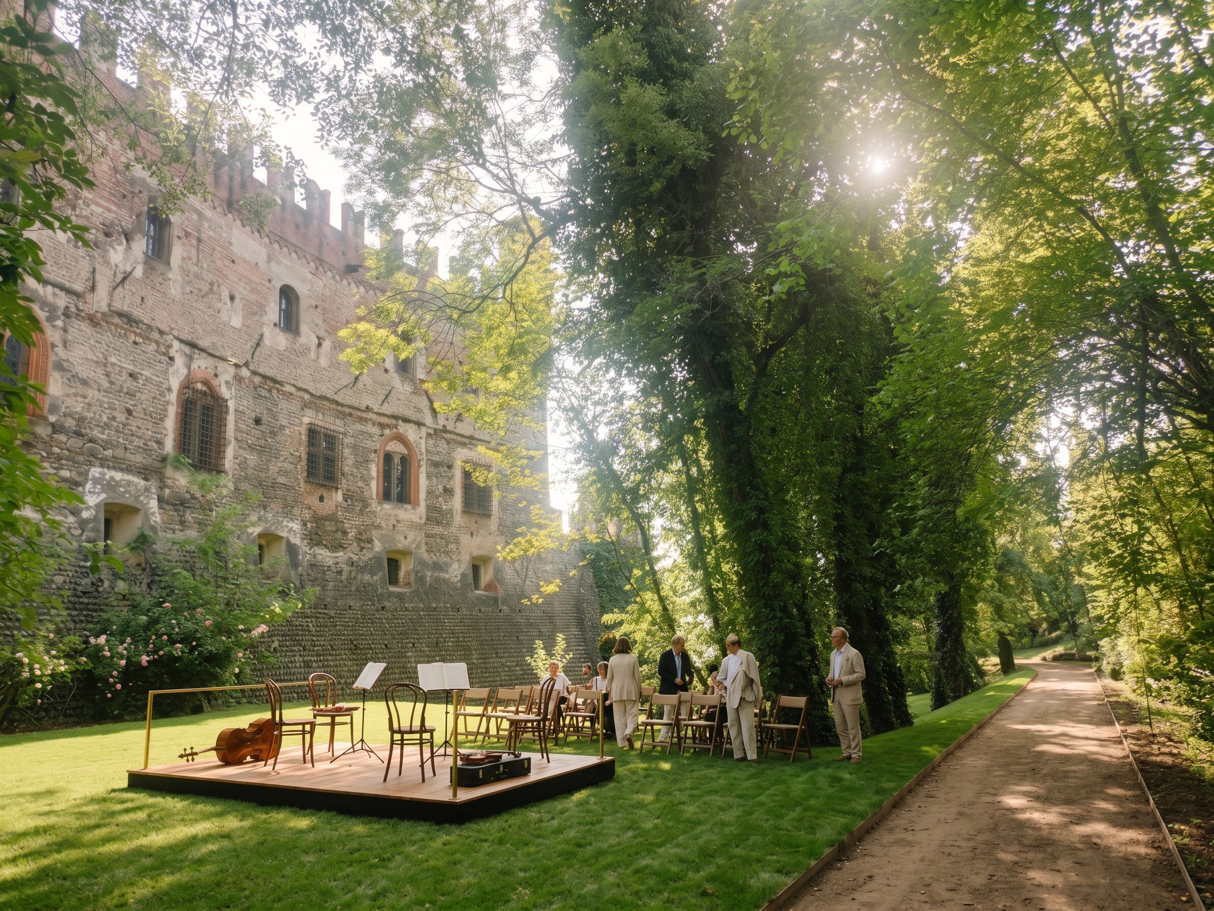 PromptCastello Malgrà alla base delle antiche mura c'è un piccolo prato in leggera pendenza da mantenere da sistemare in modo curato per ospitare un concerto di musica classica con piccolo palco. Sulla destra sistemare con terra stabilizzata il sentiero in leggera salita che appena si vede ed è ad una maggiore quota . Migliorare la sistemazione arborea , keep exact camera angle