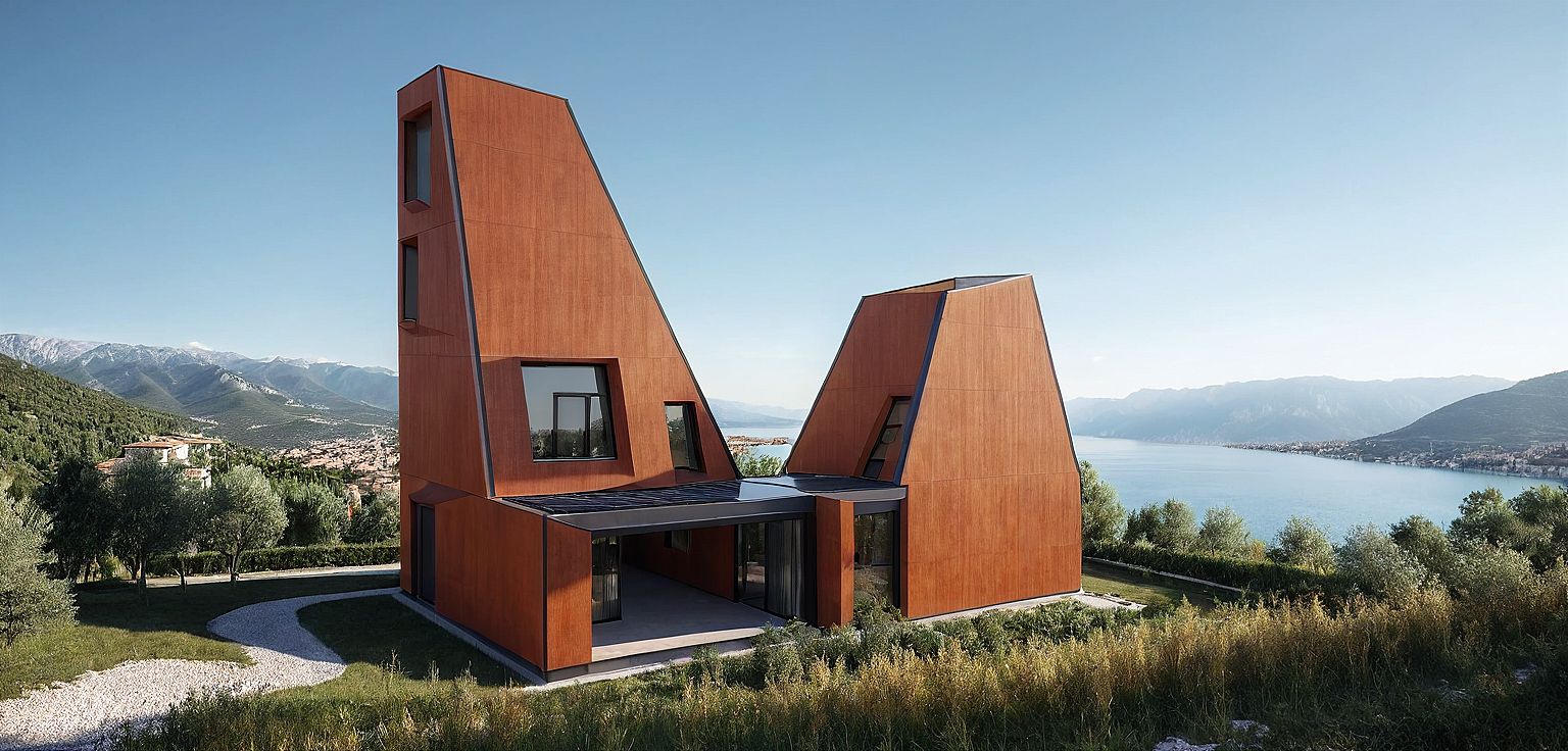 Promptbuilding structure is x-lam panel with load bearing wall exterior facade is covered with cor-ten alluminium that has bronze orange brown color , One big tower and one small tower. Two towers all have windows which all are bow windows with simple design, on the first floor there is living room with big window. There is terrace on the second floor between two towers . top of the tower have a skylight window with solar panel . Building is located in Verona Malcesine, on the little hill in the middle of the trees and grasses