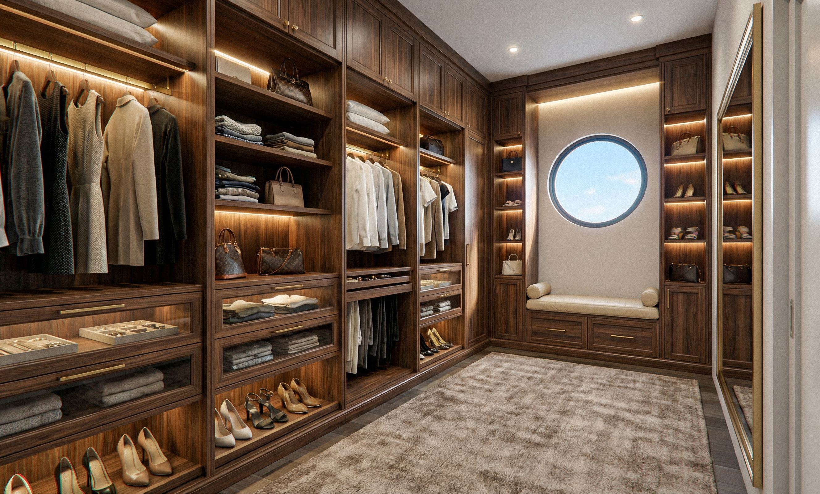make luxury Master WIC with built-ins throughout, other misc. items where appropriate, no island, room is 7 feet wide, 16 feet long, 10 feet high, no cross in round window, bench built-in below window, sky view through the window, do not stretch the image, keep the exact angle, keep exact camera angle