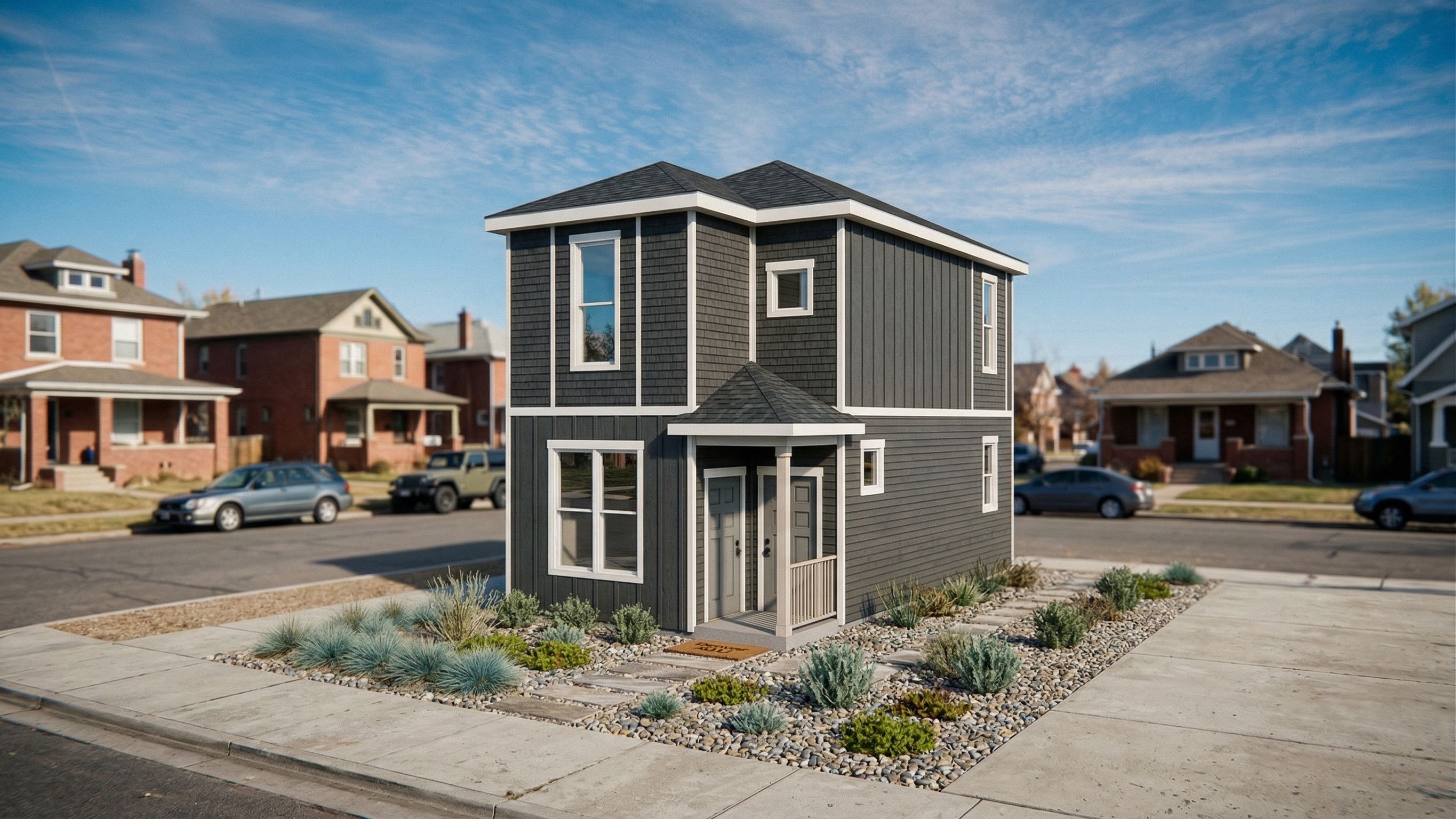 This will be a 3-dimensional render of an ADU. This ADU will be in Denver Colorado on a street in the city. keep the elevation the exact same as in the image. do not add or change the windows, door, or the roofs. Place minimal consistent landscaping at the front. The main materials will be a what is shown. the extent of the adu is only what is show in the image. do not add extra parts of the house., keep exact camera angle, keep exact camera angle