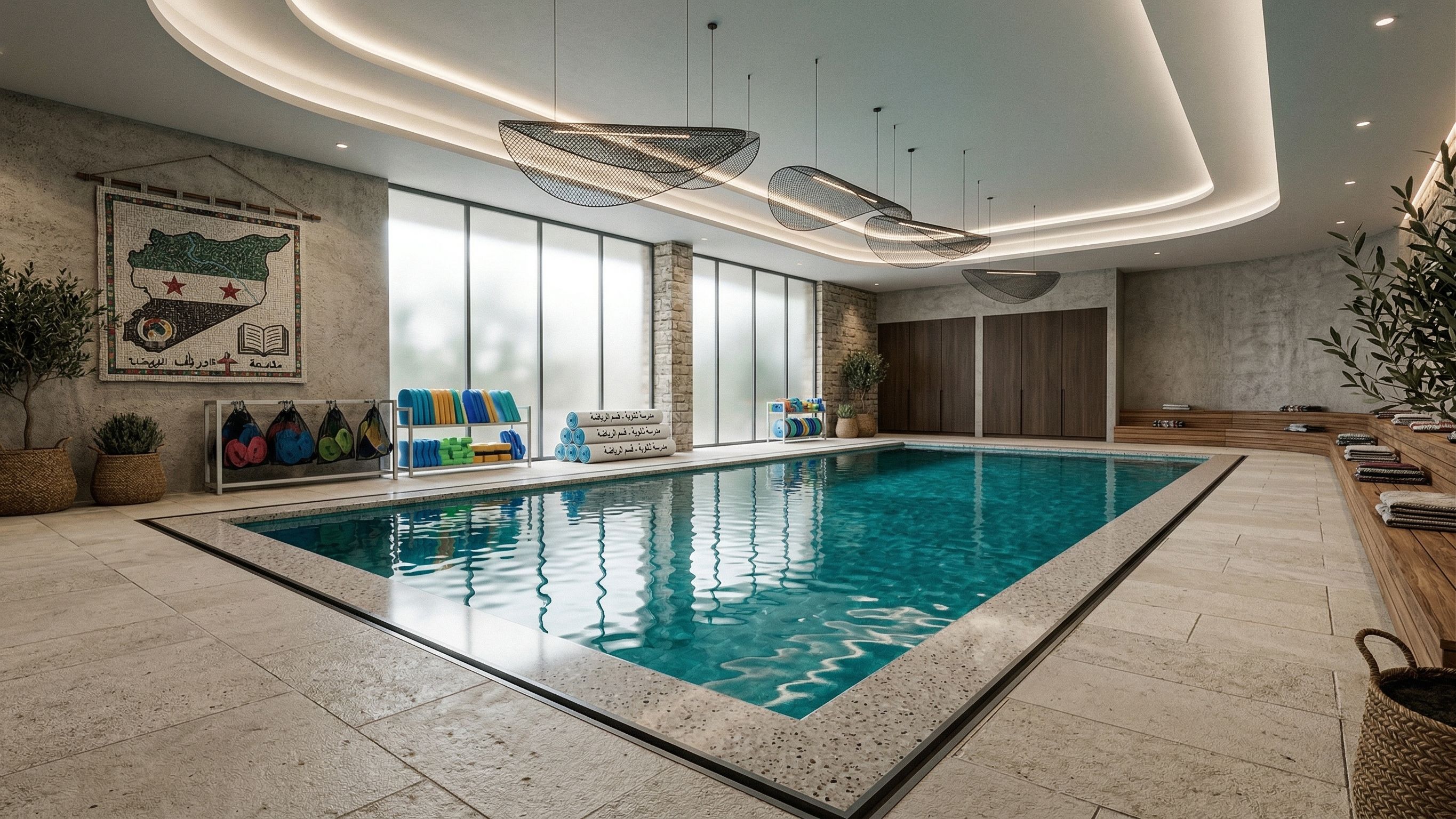 this is a scene of a educational swimming pool in syrian high school for student .. do simple interior and enhance the materials and make it super realistic and add swimming learning equiomwnts