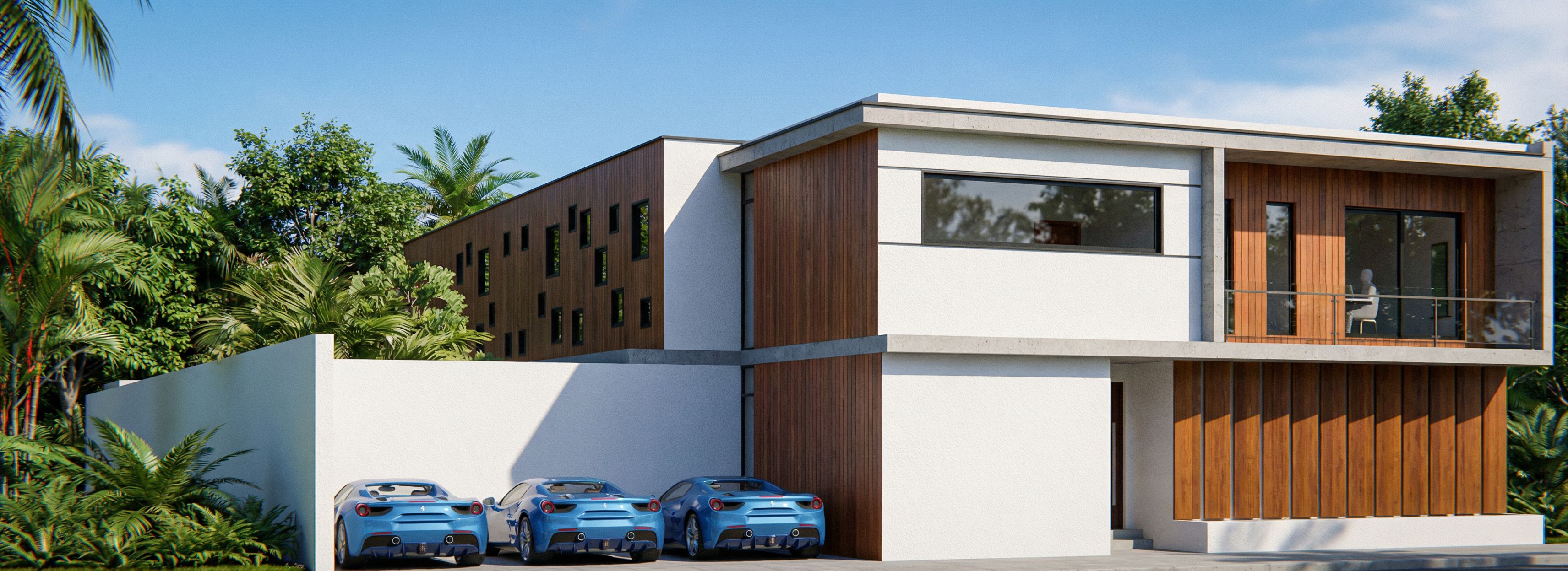 Generate a photorealistic architectural photograph based exclusively on the attached image. Maintain the layout, viewpoint, and façade strictly unchanged, faithfully interpreting colors, materiality exposed concrete, laminated glazing, ipê timber, textured paint, and all existing overlays. The surroundings must include organic tropical landscaping with vegetation typical of Brazil only as a background setting, without encroaching on the façade. If adjacent houses are present, they must be preserved. Lighting must replicate realistic tropical daylight, and the final output must read as an ultra-sharp 8K real photograph, as if captured with a 16 mm wide-angle lens, f/4, ISO 100, with no rendered appearance., keep exact camera angle