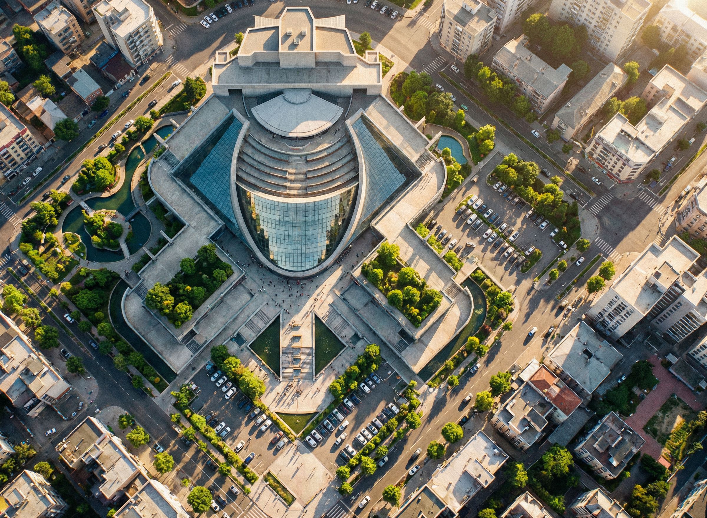 PromptPhoto of a modern civic center complex featuring a prominent auditorium at its core, designed with sweeping curves and large glass facades. Surrounding elements include landscaped parks with vibrant greenery and well-defined pathways. The setting is urban, framed by surrounding buildings and bustling streets. The scene is illuminated by warm afternoon sunlight, creating dynamic shadows and highlights across the architectural features. Captured from a bird’s-eye view to emphasize the layout and spatial relationships, with a wide-angle lens to showcase the expansive environment.