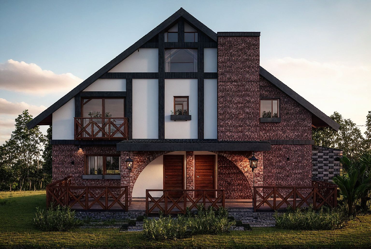PromptGerman-style countryside house facade made of bricks in reddish tones, dark wood, and DARK stones in some areas. The house is in the middle of a field in Paraguay. THE HOUSE HAS FRESH COLORS, AND IT HAS A CABIN ESSENCE.